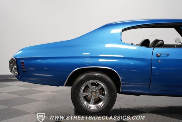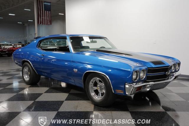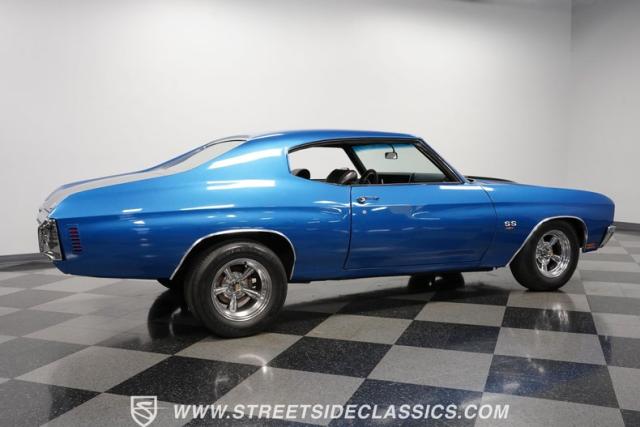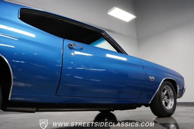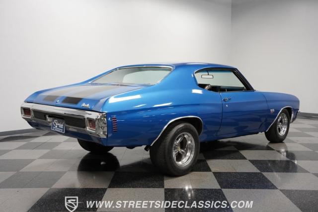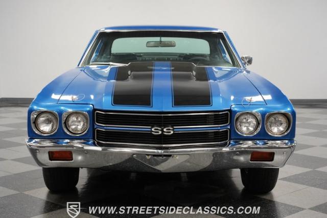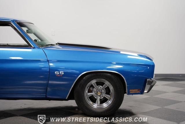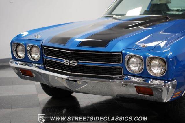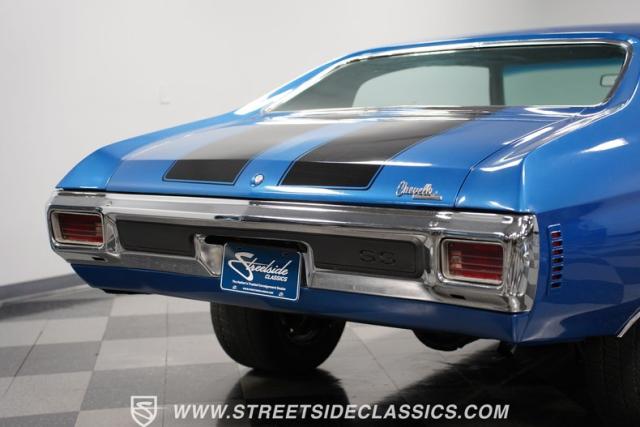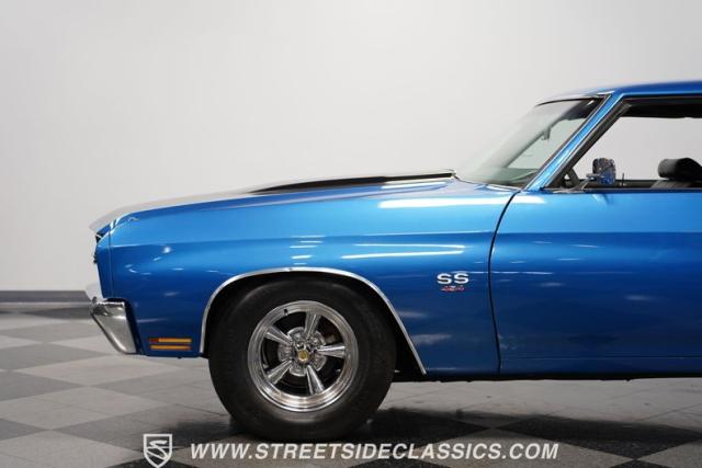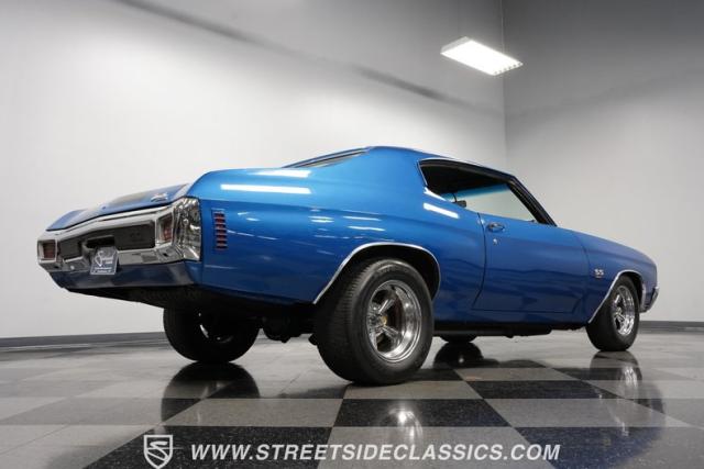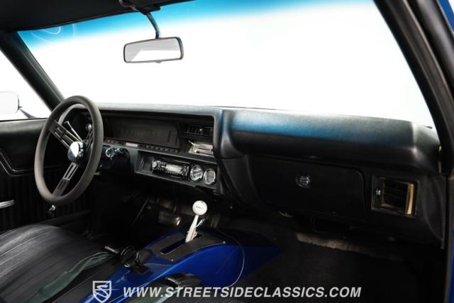 This Atlanta-built 1970 Chevelle SS 454 Tribute makes a bold appearance in metallic blue with black racing stripes. The muscular profile is enhanced by gleaming chrome bumpers and trim accentuating every curve. The wide stance is anchored by 15-inch Pacer wheels, with meaty 225/75R15 rubber up front and massive 295/50R15 tires in the rear. The body modifications include custom SS badging and dual sport mirrors that amplify the performance-oriented look.