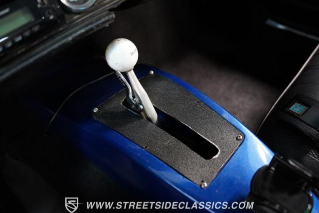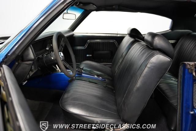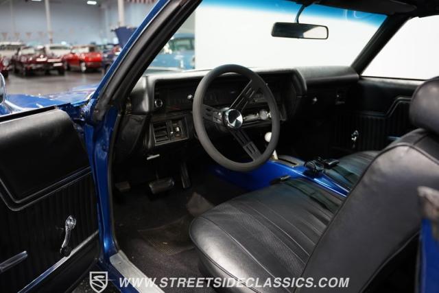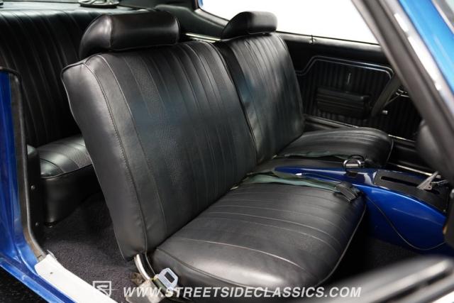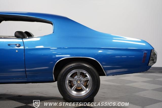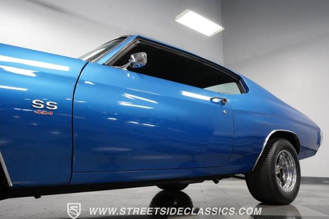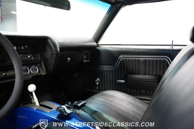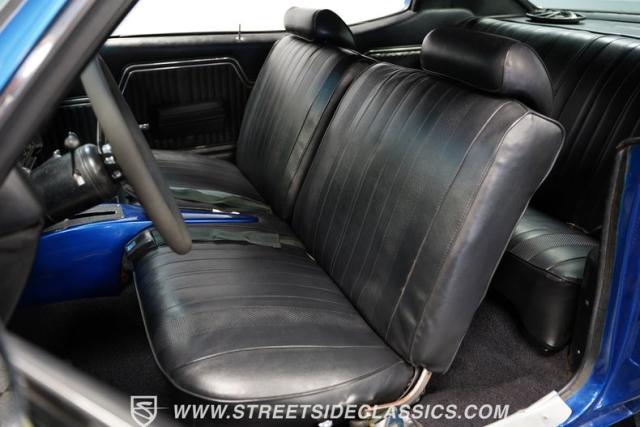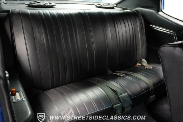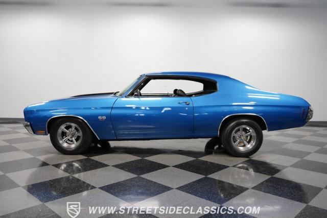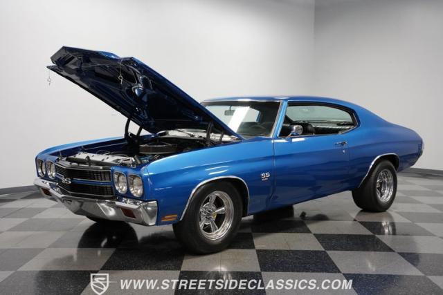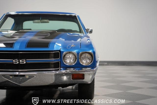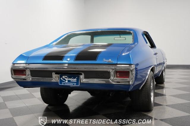 This Atlanta-built 1970 Chevelle SS 454 Tribute makes a bold appearance in metallic blue with black racing stripes. The muscular profile is enhanced by gleaming chrome bumpers and trim accentuating every curve. The wide stance is anchored by 15-inch Pacer wheels, with meaty 225/75R15 rubber up front and massive 295/50R15 tires in the rear. The body modifications include custom SS badging and dual sport mirrors that amplify the performance-oriented look.