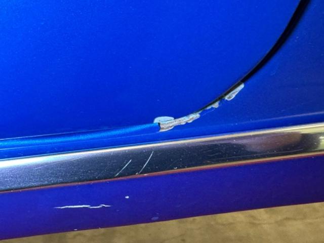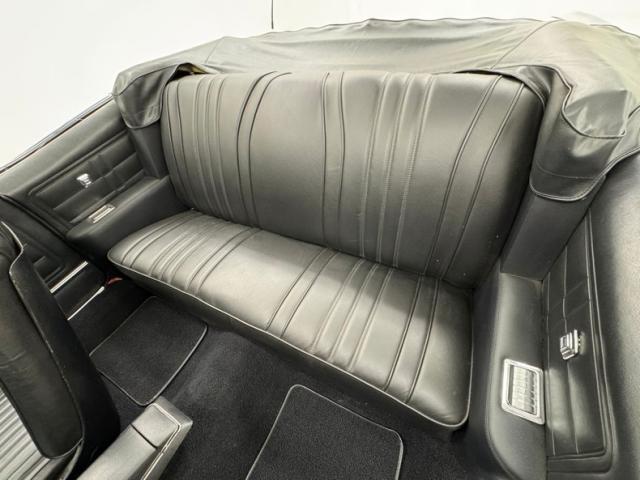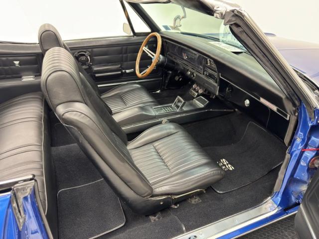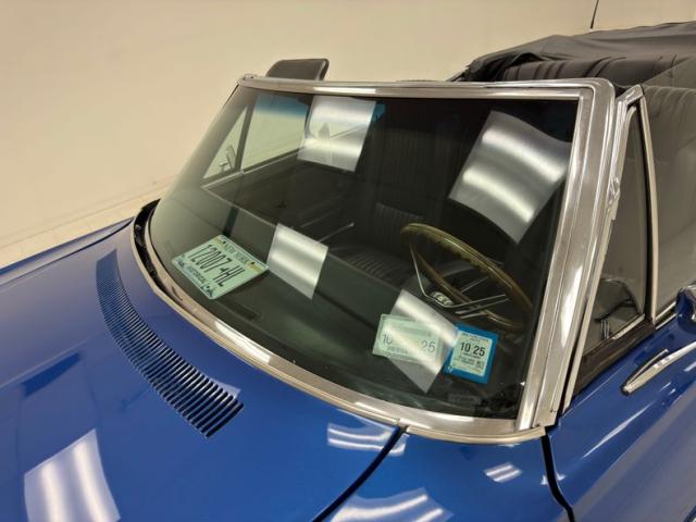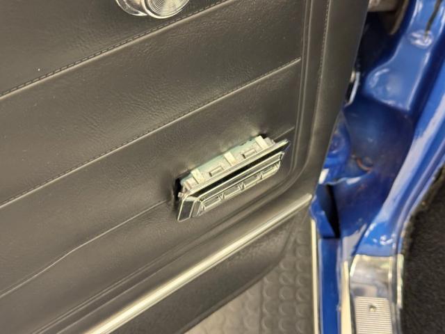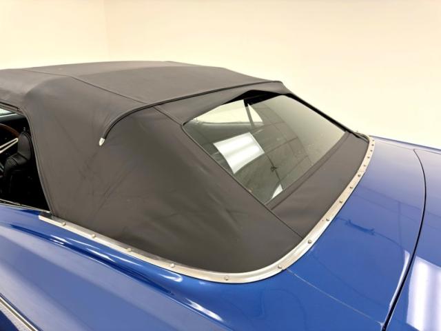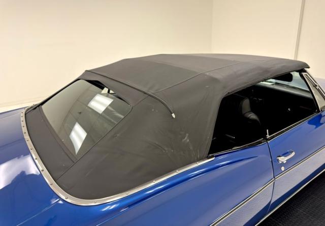 An ocean of Medium Blue Metallic now covers this car in two stage shimmer which is the perfect complement to the bookends of robust chrome bumpers, in the front which includes an egg crate grille and chrome headlight bezels for the quads. Meanwhile, the epic trio of tail lights in the back are embedded in the chrome bumper, capping off a huge decklid and serving as the latch panel as well. A blue valance sandwiches the bumper and twin pipes below straight out the back. The side trim piece here has a main black center and creates a nice match for the black canvas top, here in good condition with some separation at the glass window. Super Sport emblems abound and 15-inch American Racing wheels carry 60 series tires on all four for a sporty presentation that doesn\'t lose its pedestrian appeal. Metal and paint are generally good with imperfections that include chips, cracking paint, bubbling, and some rust on the rocker panel.