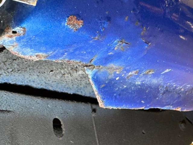 The shine continues underneath where a polished differential cover sparkles like a mirror. There\'s surface rust around, mostly reserved for the rear axle while dual exhaust flows from headers in the bay to FlowMaster mufflers, finding their way after some funky welds, to the back and exiting through chrome tips. The knuckles and pans are clear but we do note some flaking rust on bottom pans and undercoating throughout and some wrinkling of the metal at the driver\'s heel/toe board. Suspension is constructed with coil springs up front and a 3 link, coil springs and a panhard bar out back.