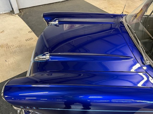 Painted a beautiful Cobalt Blue that is slick and straight. Hand painted blue and silver pin stripe and around mirrors and hood emblems and hood rockets. The front and rear bumpers are like new. Grill bar assembly, grill, headlights and trim, bumper bullets, black rubber, rear tail lights and trim, license plate light, all emblems, back up lights, all trim polished, window moldings polished, wiper arm polished, wiper arms are chrome, dual outside mirrors, door handles and locks, felt and rubber vent windows, Cragar rims with Starfire tires all like new. A real eye catcher! Gets the looks and sits good!