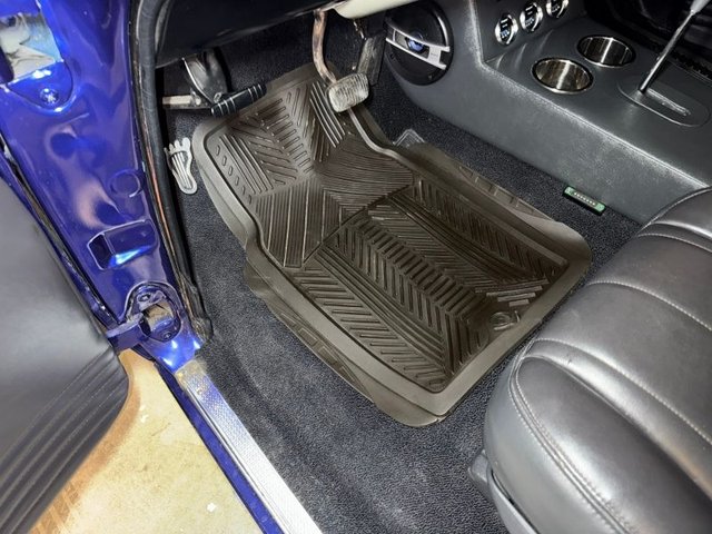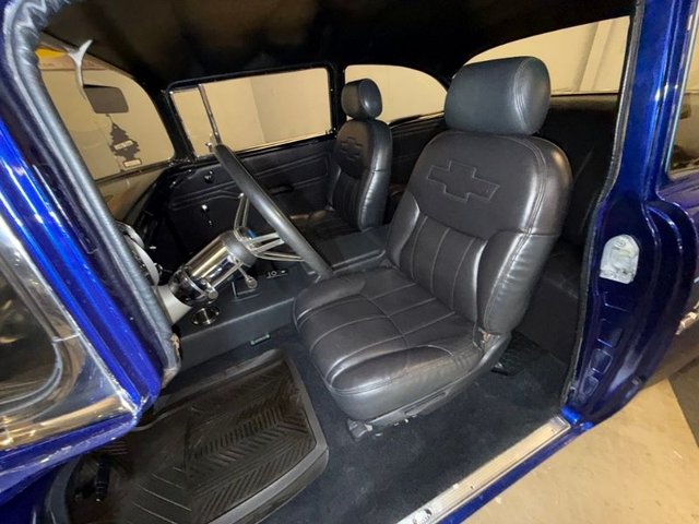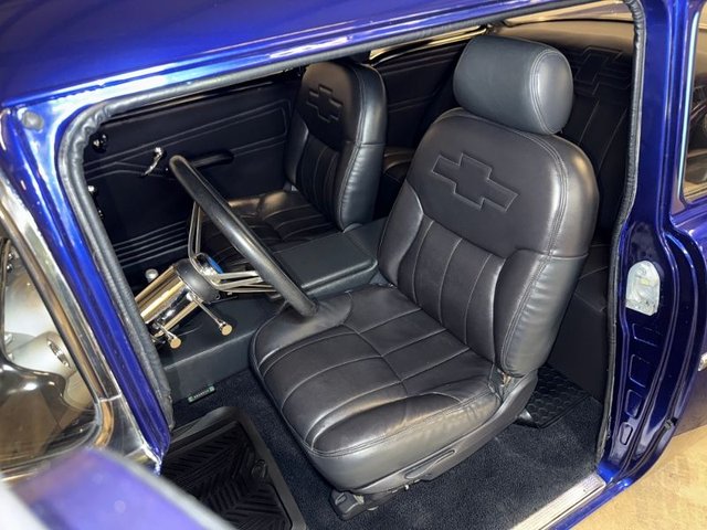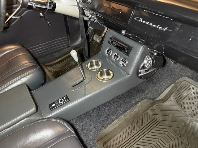 Interior is Gray, driver’s seat is power, and passenger is manual; both will recline back, door panels custom design. Back custom design, door handles, window cranks, arm rest, package tray, gray headliner, kick panels, door sill plates with Fisher logo, original style dash with speedometer, temp, gag gauges, chrome tilt steering column, 3-post steering wheel with rubber grip. Chevrolet logo horn button. Custom built console with 2-stainless cup holders. Automatic Lokar shifter, SunPro Gauges built in, Oil-Volts-Temp. Sony AM/FM/CD in console, black carpet, black rubber floor mats, dimmer switch, Surfer foot brake pad, Sony speakers mounted in the side of the console. Autogage vacuum boost under the dash. Rearview mirror all like new. Looks really neat and clean inside.