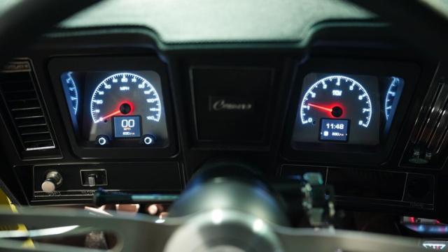Inside, the cabin showcases a blend of classic style and modern comfort. Black leather and cloth bucket seats with houndstooth inserts provide a performance-oriented feel. The dash houses crisp aftermarket gauges, while Vintage Air controls are cleanly integrated. A sleek console shifter for the 4-speed manual transmission takes center stage. The headliner and all trim pieces appear fresh from the factory floor. Notably, this Z28 forgoes a radio, focusing instead on the pure driving experience.