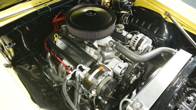 Powering this Camaro is a ZZ6 350 CI V8 crate engine, a modern powerhouse that brings reliable muscle to this classic. It\'s paired with a 4-speed manual transmission, delivering an engaging driving experience. The engine bay is a showcase of performance upgrades: aluminum heads, a high-rise GM intake topped with a Holley carburetor, and an electronic ignition system. Long tube headers feed into a FlowMaster dual exhaust system, producing a throaty growl. An aluminum radiator with an electric fan keeps things cool, while a serpentine belt system adds reliability. The 12-bolt rear axle puts the power to the pavement effectively.