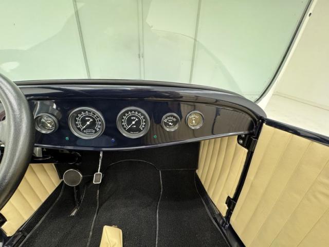 Somehow the combination of \'27 body, \'28 fenders, and \'32 front all work together beautifully. So does the combination of dark blue and light vinyl and as a bucket, the interior is as much part of the exterior as the paint. This is a fantastic build and for your reference, the front tires are 165/80R15\'s and the rears are 31x18.50x15. Now all we need is a shipping address!