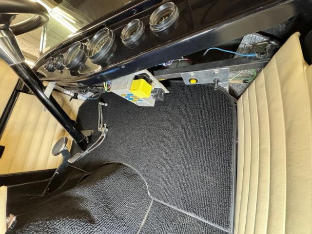Stitched Ivory vinyl is the palette of choice here, providing a nice contrast to the exterior and the bench is augmented with blue piping that delineates the pattern change to smooth. The three spoke steering wheel leads to the body matched dashboard, clean and straight and adorned with a row of Classic Instruments gauges. On the floor, an ivory vinyl boot wraps the B&M shifter over black loop carpet, all in nice shape, and the finished trunk includes a carpet covered gas tank.