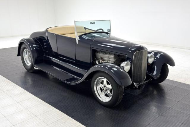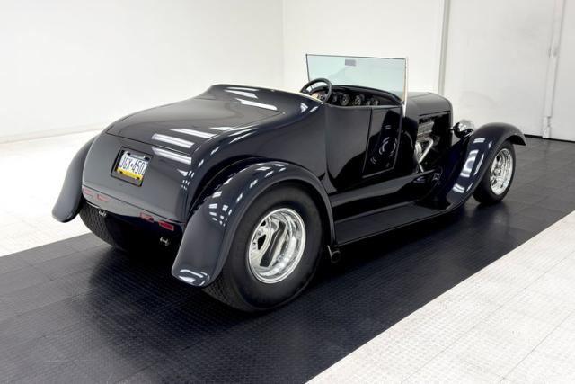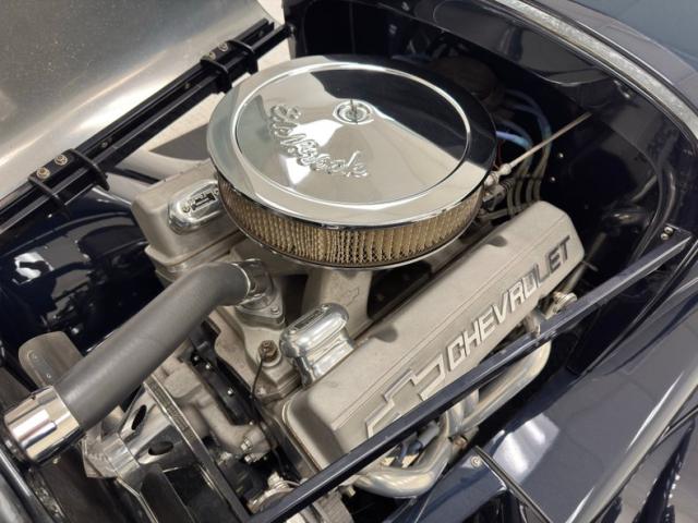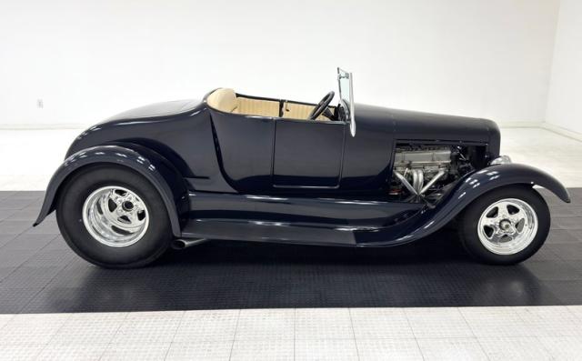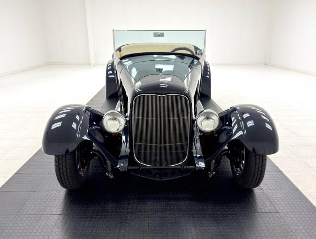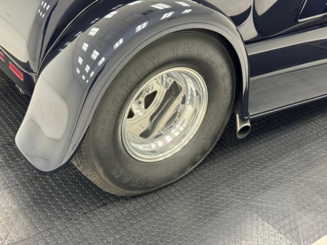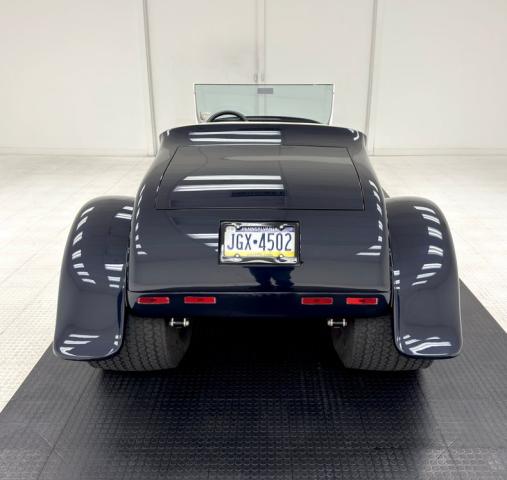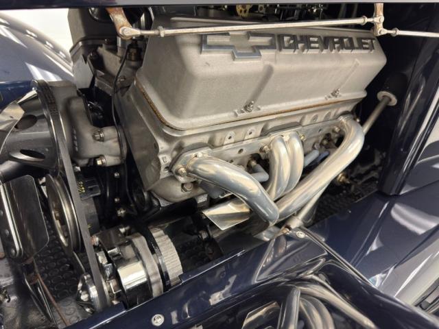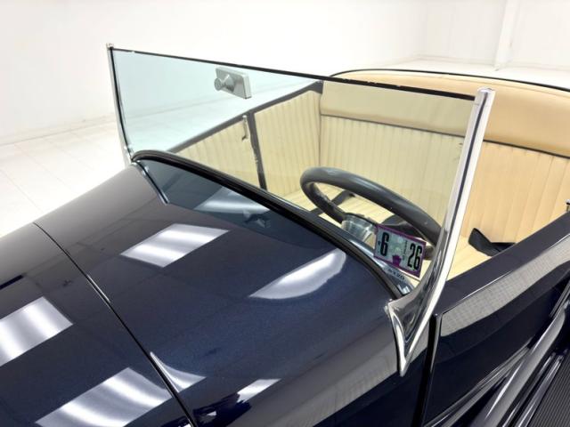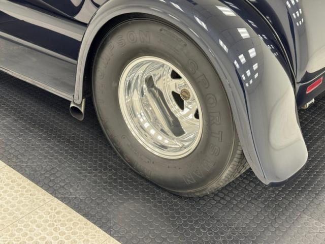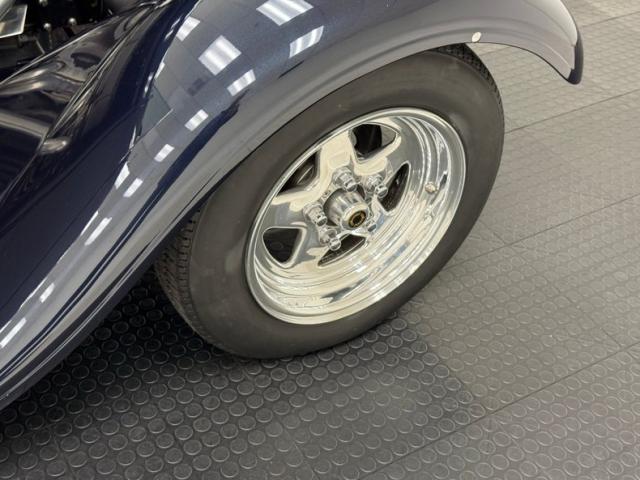 Two stage Midnight Blue coats this roadster and we\'re talking deep paint here and in certain light, it can look black while other light brings out the navy blue and it\'s nicely applied. Once you\'ve absorbed the beauty of the paint, the wheel set up is next to compete for your attention, stacking 15-inch Weld wheels with vastly different widths and tires sizes, creating that classic hot rod stance that\'s been a proven winner for about 80 years, here under fiberglass fenders connected by a steel running board. In back, the rectangular quartet of tail lights get your attention right before the massive meats grab your eyes as they peek from narrow fenders. Up front, the fiberglass \'32 radiator shell looks perfectly at home next to the aluminum hood which connects seamlessly to the fiberglass body. A modest windscreen with nicely sculpted posts completes the exterior which shows no glaring imperfections.