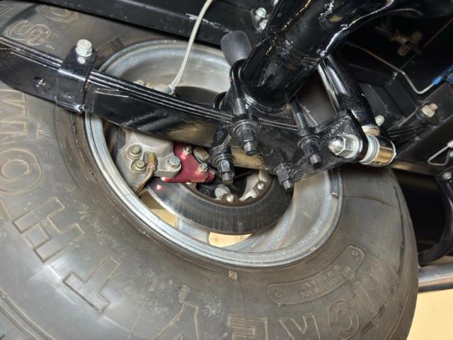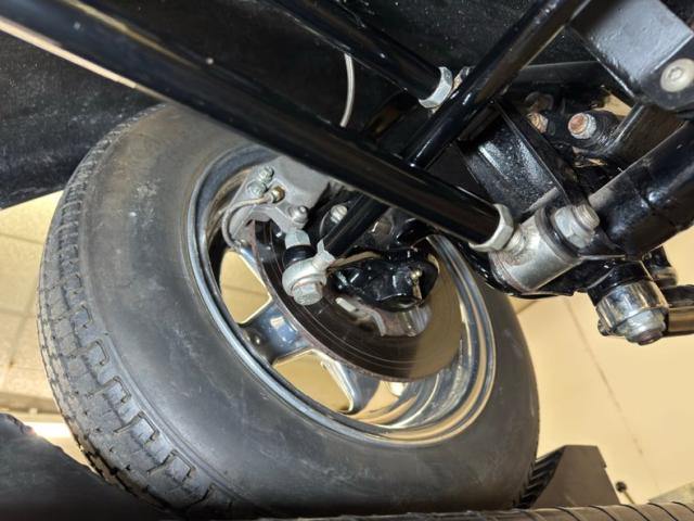 Same here, clean and showy with glossy black paint and some polished components too. Dual exhaust takes in glasspack style mufflers before heading east and west to exit in front of the rear tires. Disc brakes are at all four wheels and suspension is a 4-bar with transverse leaf spring up front and leaf springs in back.