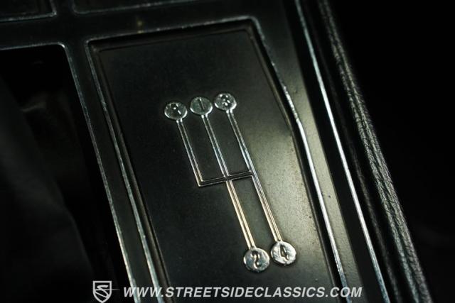 Inside, we find a stock and mostly original black vinyl interior. A full-length center console separates a pair of recovered bucket seats. A three-spoke, wood-rimmed steering wheel shows off a Crossed Flags center cap as it stands ahead of a vast 160 mph speedometer and 7,000 rpm tach, while a five-pod set of auxiliary gauges sits at the top of the center stack. Dial-based HVAC controls keep things simple, while the aftermarket cueball shift knob adds just a touch of contrast to keep things interesting.