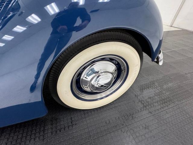 The narrow, upright grille is rendered even more stately by the amber fog lights and the outstretched Greyhound hood ornament, and it\'s all uphill from there! Gleaming two stage Washington Blue paint covers the steel panels bisected by a single, cream colored pinstripe. Hood vents are lines with polished trim which complements the other polished elements including the slim grille surround, the bold bumpers, and the hubcaps and beauty rings on the 16-inch artillery wheels which are color keyed to the body. White wall tires cap off the classy look while a leather clad Varco trunk is mounted in back behind an encased spare tire. Imperfections include touched up scratches and chips on a fender and numerous other spots, and some dry rot on the rubber coating of the running board.