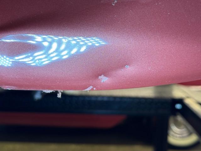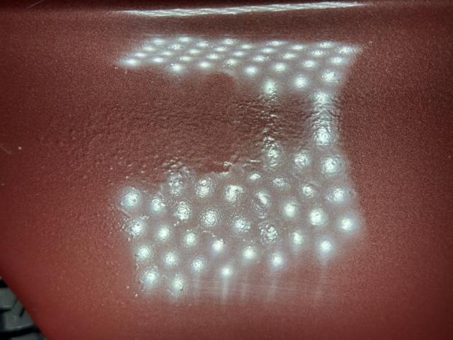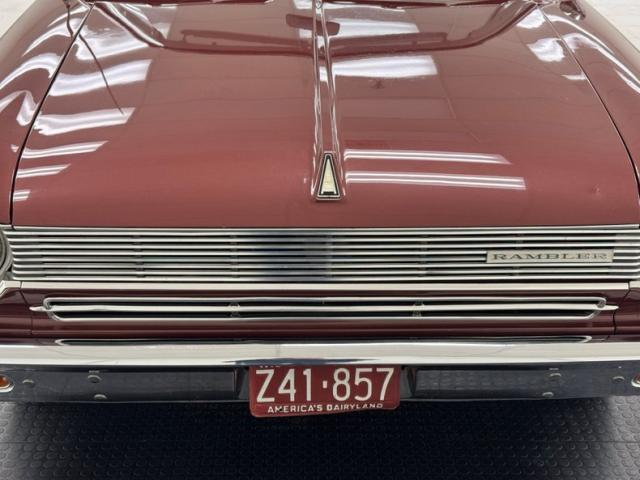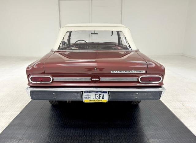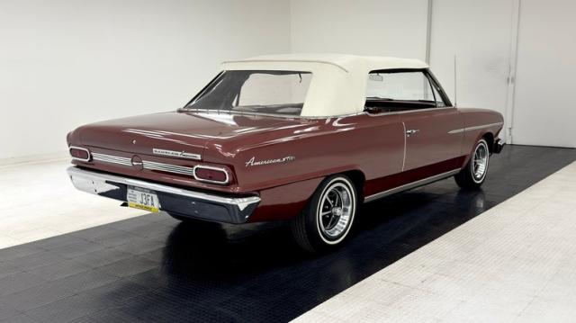 Simple, basic, and classic are the lines of the Rambler. It\'s one of those cars that could easily represent \"car\" in an encyclopedia, (remember those?). Vintage Burgundy covers the flat panels nicely, accented by a front spear that crosses the hinge gap and onto the door. Inset round headlights bookend a straight vertical grille and the straight theme continues with the front bumper, oval markers embedded. That oval shape returns as tail lights, perfectly trimmed in chrome, flanking even rows of trim that mimic the grille in front, a popular design cue in the 60\'s. 14-inch Magnum 500 wheels with deep set trim rings enhance this, the highest horsepower version of the \'64 American while up top, the white canvas top and its plastic window are in great shape. Same could be said for the metalwork and paint on the car which is near show quality. But of course, no car is perfect and on this one we find a ding, some curdled paint, orange peel, and some chips.
