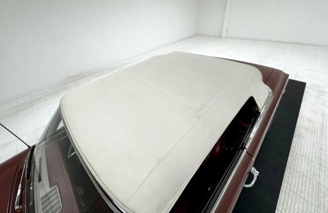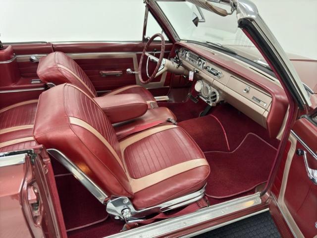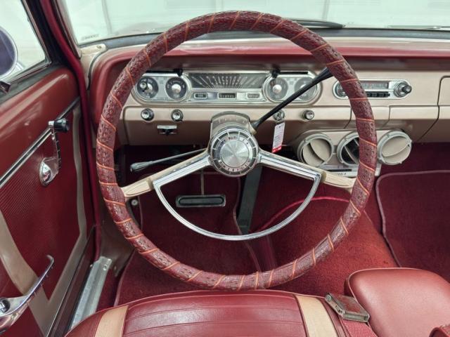 Taupe angular accent lines enhance the red vinyl door panels with body colored header and kick panel, both doors showing some patina but are intact. The colors repeat on the vinyl seats which are based in chrome shells with robust push buttons for moving the seat. The back bench is a twin of the front in design and material and rear passengers are afforded an ashtray and window roller on each side. The steering wheel holds a horn ring on the lower half and the rim is wrapped in an aftermarket but matching vinyl cover. While the dash is typical 60\'s with metal trim and knobs, the speedometer display is unique as the numbers expand as they widen, as if exploding from the bottom in a design we rarely see. Ovals are used on the dash, around the instrument cluster, around the AM radio, and around the trio of vents, just above an air conditioning system our consignor states does not blow cold. Red loop carpet and low pile mats on top show a touch of patina but entirely presentable, while the trunk has an extra large mat and an original looking wheel cover on the spare.