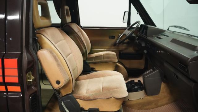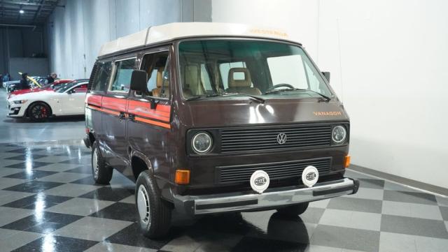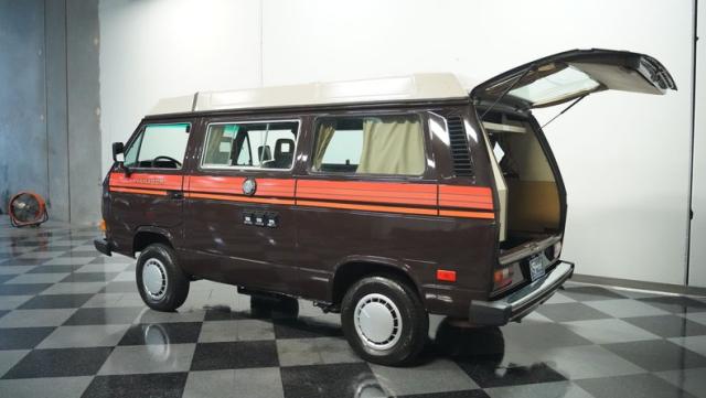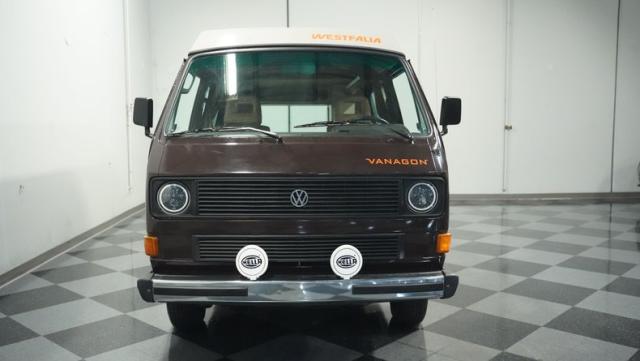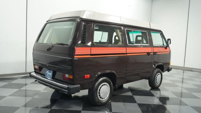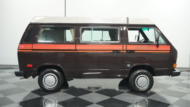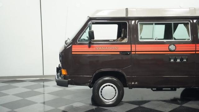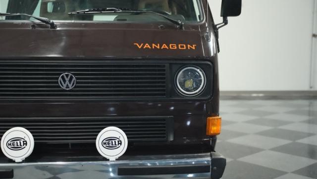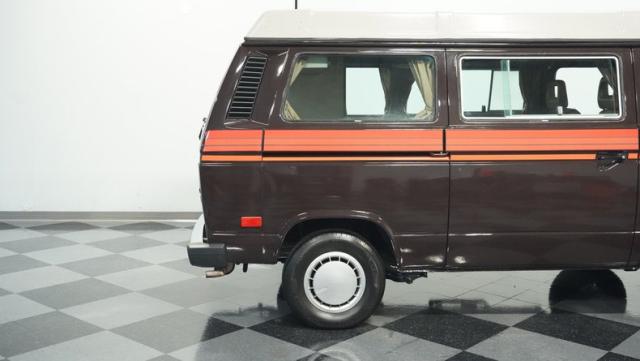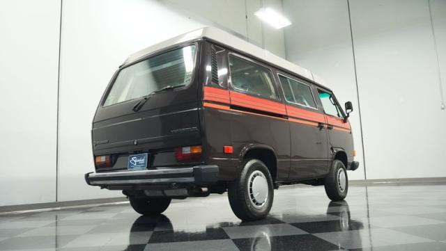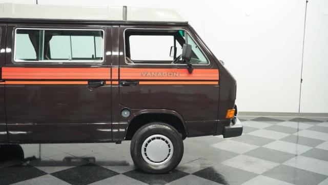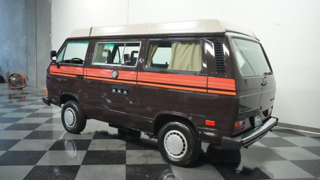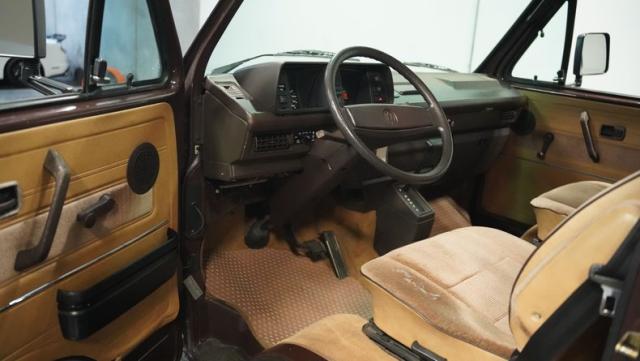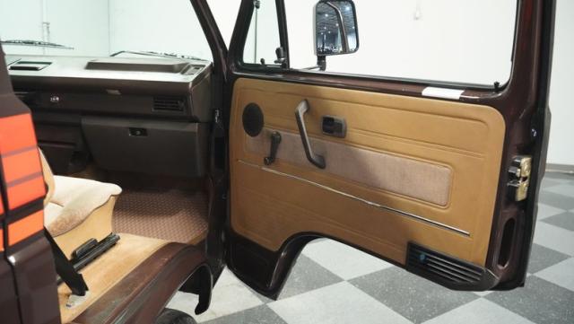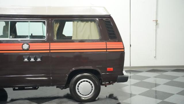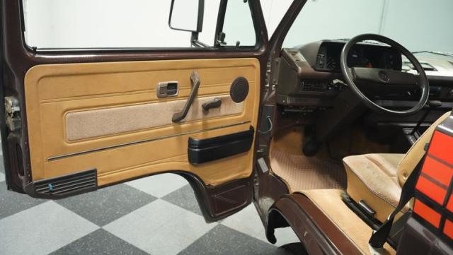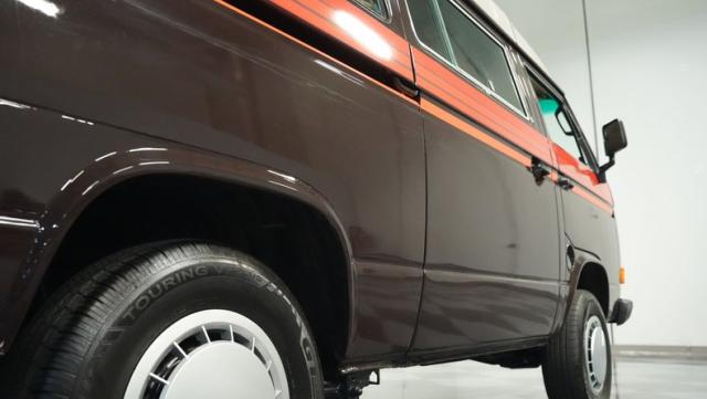 This 1985 Volkswagen Vanagon GL Westfalia Camper, with only 59,032 believed actual miles, is your ticket to boundless exploration. Its Agate Brown paint job, accented by bold orange Vanagon decals, evokes the earthy tones of forest trails and desert landscapes. HELLA off-road lights pierce through the darkest wilderness, while the camp awning provides shelter from sun and rain alike. Perched on 14-inch wheels with grippy 205/75R14 tires, this Vanagon is as comfortable on backwoods paths as it is on highways, ready to carry you to your next outdoor adventure.