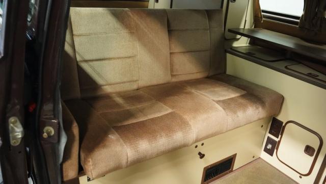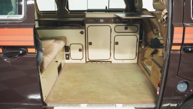 Step inside, and you\'ll find a beige interior that\'s a cozy basecamp on wheels. Swivel the high-back captain\'s chairs to create an impromptu planning station for your next hike or climb. The full camper setup transforms seamlessly from daytime exploration hub to nighttime retreat, featuring a practical stove for trailside meals, a sink for easy cleanup, and ample storage in the closet and refrigerator for your provisions. When it\'s time to rest, the Westfalia offers a variety of sleeping options: an up-top bed for stargazing, a fold-out bed for fireside stories, and even a front \"Child\'s Cot\" for young adventurers. The custom dash console houses an AM/FM radio with Bluetooth, perfect for streaming your favorite outdoor playlists or checking weather reports. Original bug screens keep the critters out while the skylight vent lets in fresh mountain air.