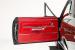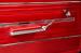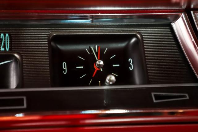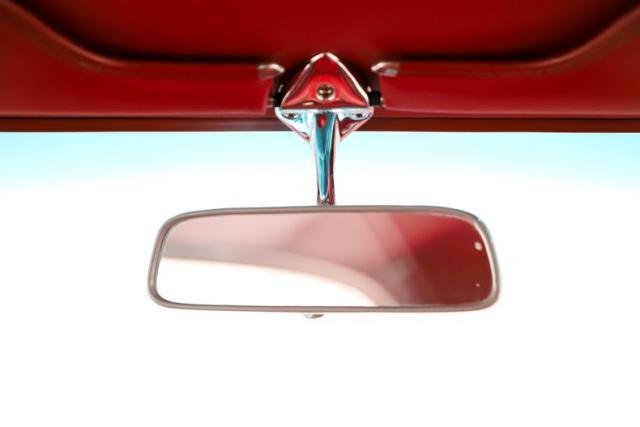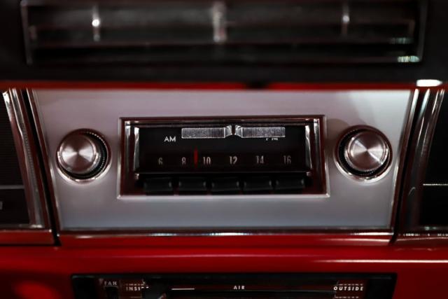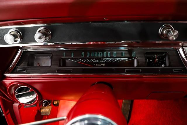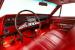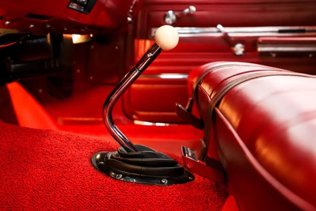 INTERIOR: Wow, the factory code 747 medium red interior pops! He had a reproduction interior installed including door panels, seat upholstery and carpet. The dash is all restored: instrument bezels, dash pad, heater control panel and a deluxe steering wheel. Inside the glovebox is new with the manuals. It has a factory AM/FM with factory kick panel speakers. Down on the floor it has original red seat belts, red floor mats and best of all the correct 4-speed shifter! The headliner, visors and mirror were replaced although there are 2 holes.