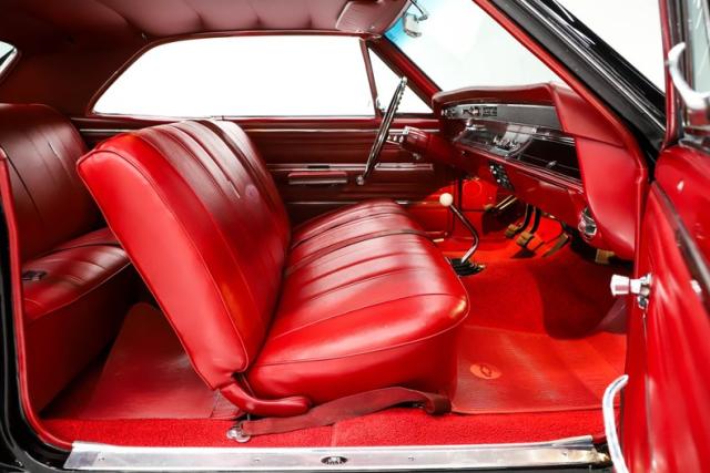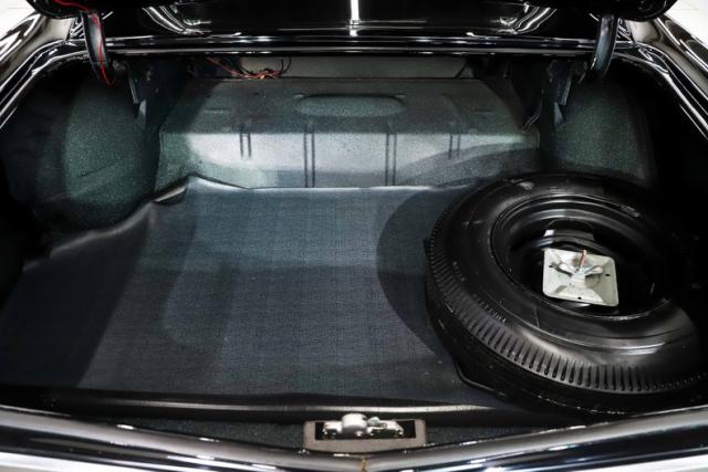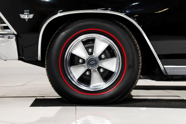EXTERIOR: This is a great looking car! Factory code AA Tuxedo Black without a vinyl top! I also like that they refrained from making it an SS clone, it\'s a Malibu. Let me tell you that the body is laser beam straight, it\'s clean and smooth from the rockers to the roof. The panels fit very nicely, doors shut like new. The black paint is literally a mirror, you can read the phone book in the reflection. It appears that all or most of the chrome and trim was replaced at the time of restoration. It has the cross flag emblems on the fenders and correct antenna. The windshield and weatherstrips were replaced. It\'s rolling on a set of mag style hubcaps with BFG radial redline tires wrapped around them.