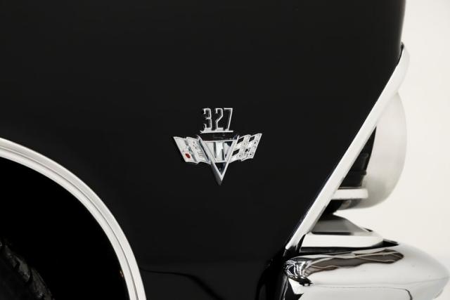 ENGINE COMPARTMENT: There\'s lots of good stuff under here including power steering, power brakes and a modern air conditioning system! At the heart of it is a period correct, spunky 327 making 350 horsepower. This includes double hump heads, factory aluminum intake, rebuilt carb, open element air cleaner and chrome valve covers. It\'s detailed right down to the stickers, fuel filter, assembly line markings, battery topper and correct hose clamps. Everything looks clean and proper. Complete with horns, hood insulation and the washers are hooked up.