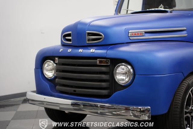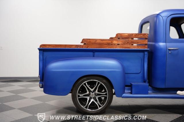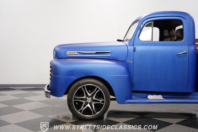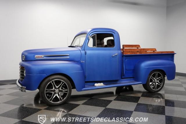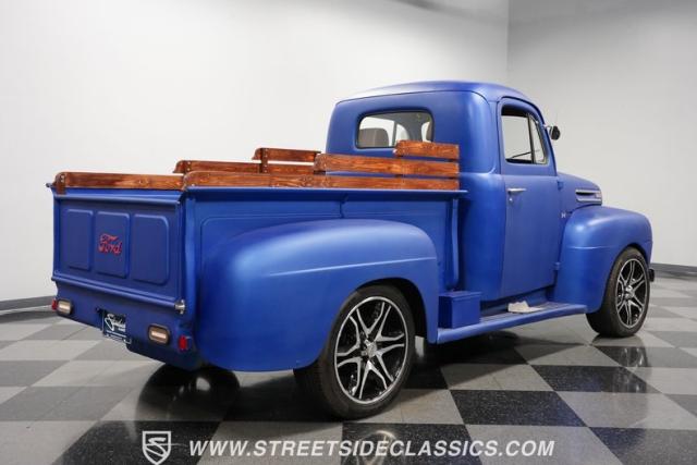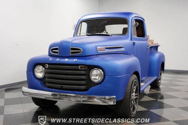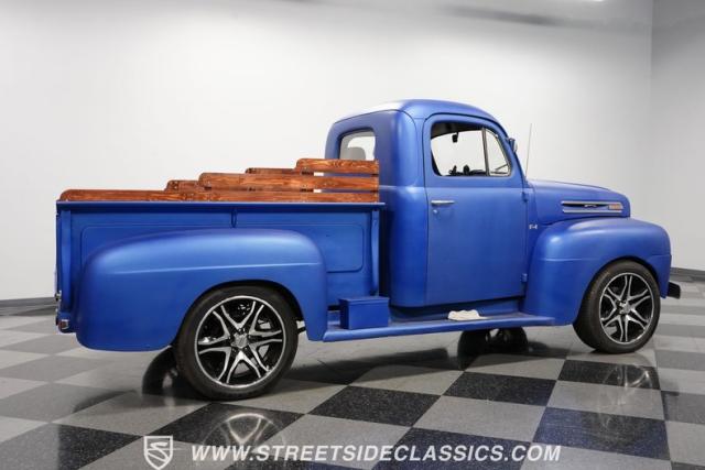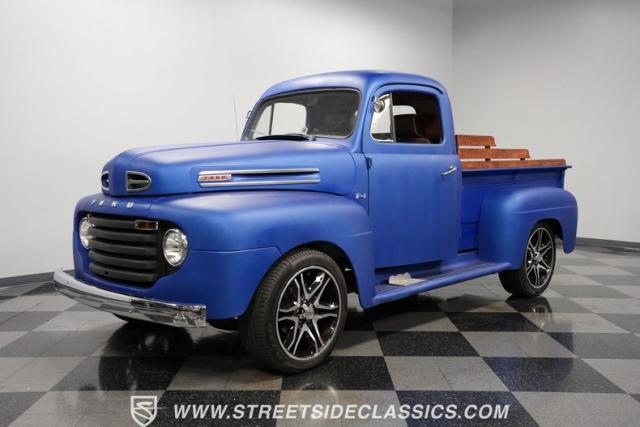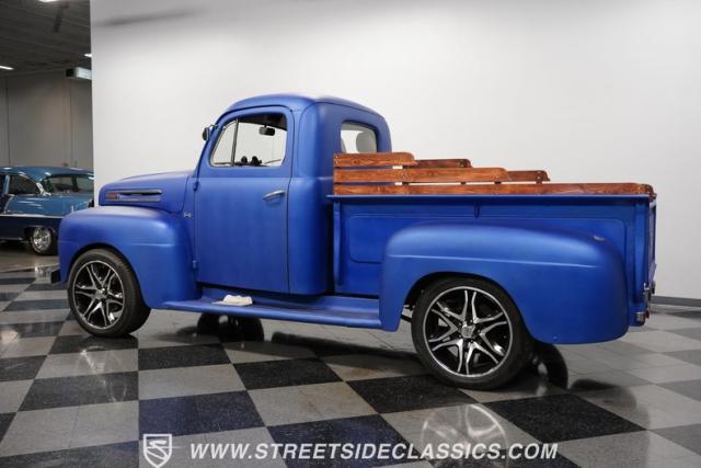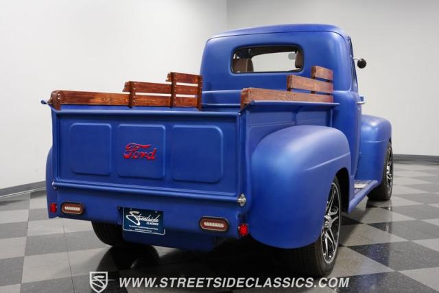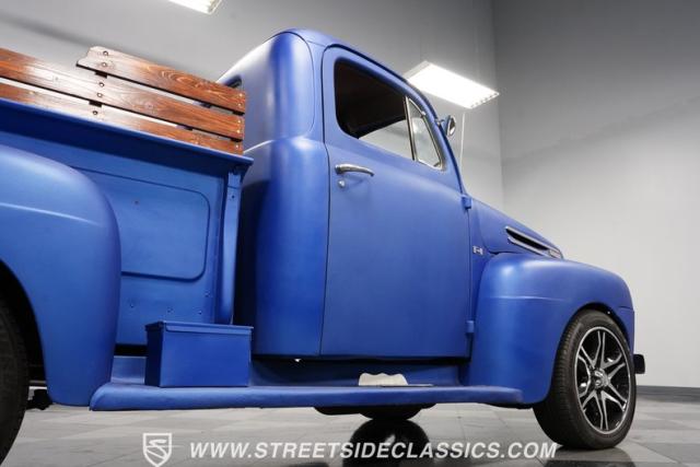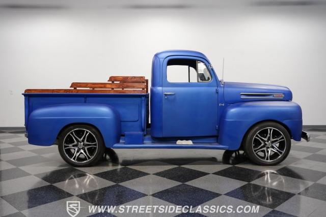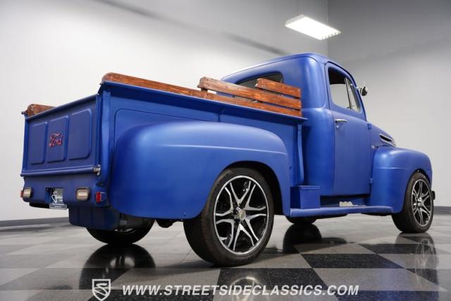 This 1950 Ford F-1 Custom exemplifies American ingenuity, transformed from its original work truck roots into a modern performance machine. The matte blue finish creates a bold presence, enhanced by custom running boards coated with color-matched bedliner material. Crafted with precision, the cargo bed showcases rich wood planks and rails, while custom-integrated brake lights blend seamlessly into the rear. American Racing 20-inch wheels wrapped in 235/50ZR20 tires provide the perfect stance. Ford step emblems adorn the running boards, adding authentic detail.