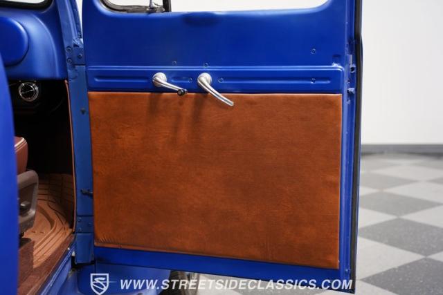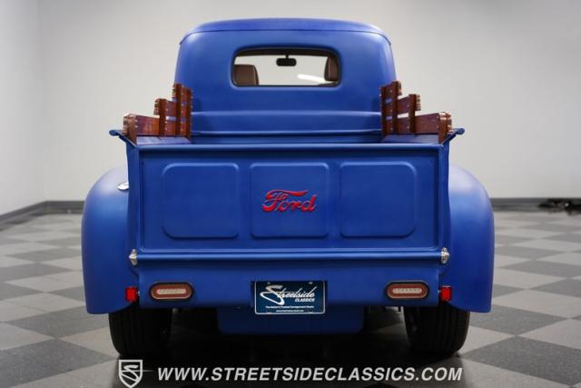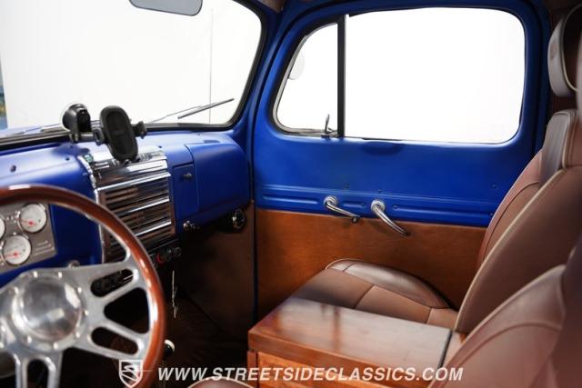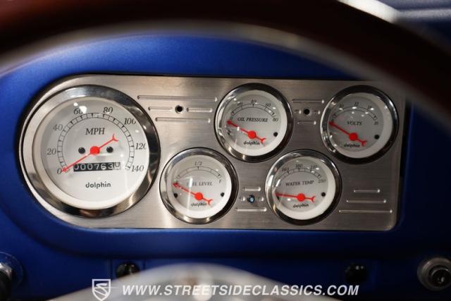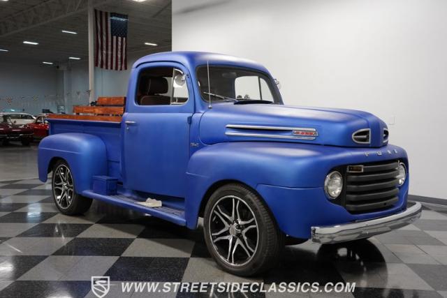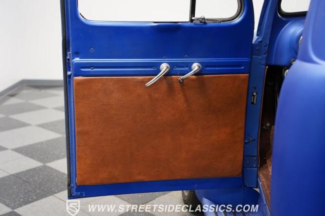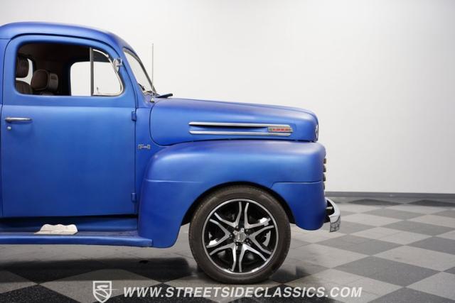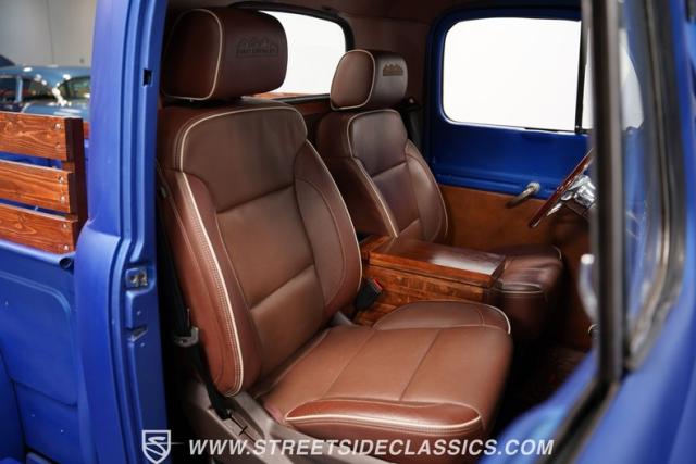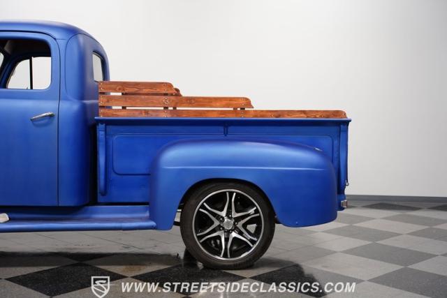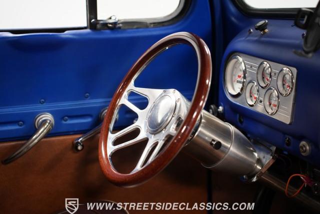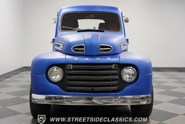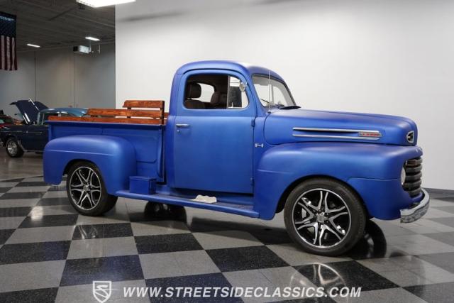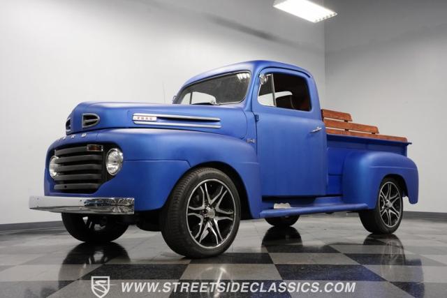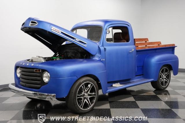 This 1950 Ford F-1 Custom exemplifies American ingenuity, transformed from its original work truck roots into a modern performance machine. The matte blue finish creates a bold presence, enhanced by custom running boards coated with color-matched bedliner material. Crafted with precision, the cargo bed showcases rich wood planks and rails, while custom-integrated brake lights blend seamlessly into the rear. American Racing 20-inch wheels wrapped in 235/50ZR20 tires provide the perfect stance. Ford step emblems adorn the running boards, adding authentic detail.