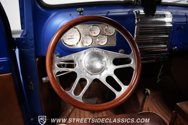 The brown leather interior showcases power heated and cooled High Country Chevrolet pickup seats, providing superior comfort and support. A custom-built wooden center console houses modern entertainment through an Omaha stereo with Bluetooth capability. The dash features Dolphin gauges in a billet cluster, while custom door panels complement the overall design. Power steering and air conditioning bring modern convenience, with controls integrated cleanly into the lower dash. A tilt column topped with a custom steering wheel puts control at your fingertips.