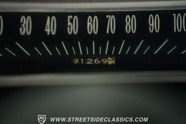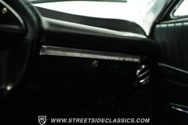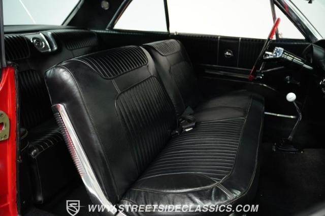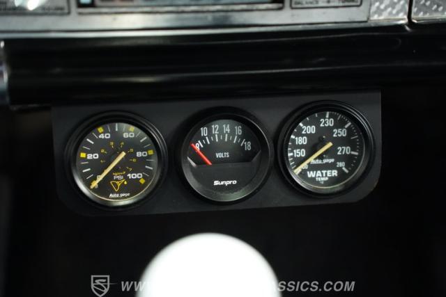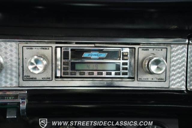 Inside, we find a mostly stock restored black vinyl interior. A split-bench front seat leaves plenty of room up front. At the same time, the old-school two-spoke, power-assisted steering wheel adds a splash of body-color red, sitting just ahead of a column-mounted 6,000 rpm tachometer and a horizontal 120 mph speedometer. A trio of auxiliary gauges sits under the dashboard, while the sliding HVAC controls and an AM/FM/Cassette radio sit against an SS-style machine-turned dashboard insert.