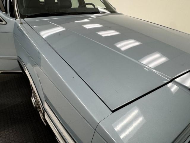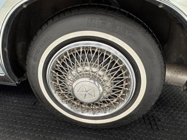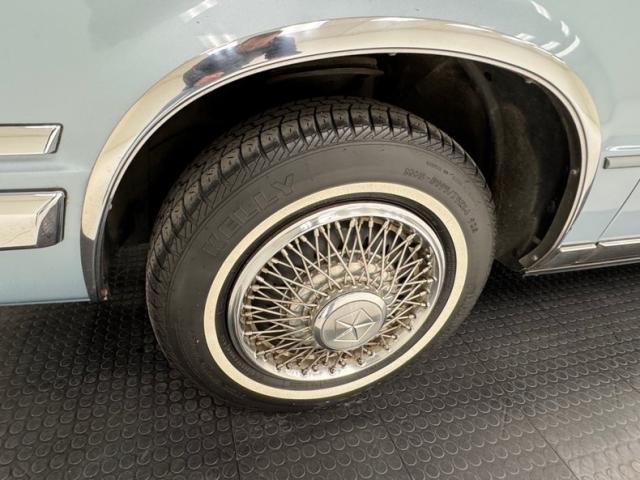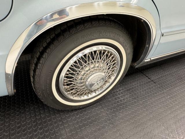 Boxy by today\'s standards, the elegance of the New Yorker is exemplified up front where hidden headlights flank a central grille, topped by a crystal ornament and framed in chrome that sprouts horizontal wings to become wrap-around trim. The Ice Blue paint is further accentuated by the chrome wheel opening trim, mirrors, and polished window sills. Up top, a silvery blue Landau vinyl top adds elegance and the coveted Mark Cross badge is posted on the brush aluminum trim along with scripted badging. The wire wheel covers on the 14-inch wheels are also special to the Mark Cross edition while the smooth decklid and vertical tail lights are shared across the New Yorker line. Imperfections on this virtual time capsule include minor chips, scratches, and scuffs throughout with a concentration on the front apron.