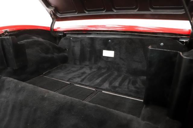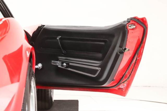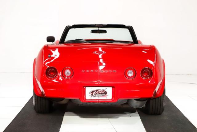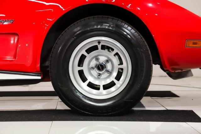 EXTERIOR: This red really pops. This car has been repainted and presents very nicely. It is super vibrant and glossy, there are freckles and touch-ups if you look for them. All the panels are beautifully aligned with nice consistent gaps. The bumpers fit very well and are in excellent shape, this was the only year for the split back bumper. The doors close easily with minimal effort, headlights open and close. The glass appears to be good original. It has been upgraded with a power antenna. The tan convertible top looks great. It is sitting on 15\" Corvette rims wrapped in size 225/70/R15 radial tires.