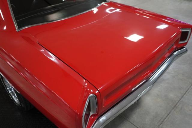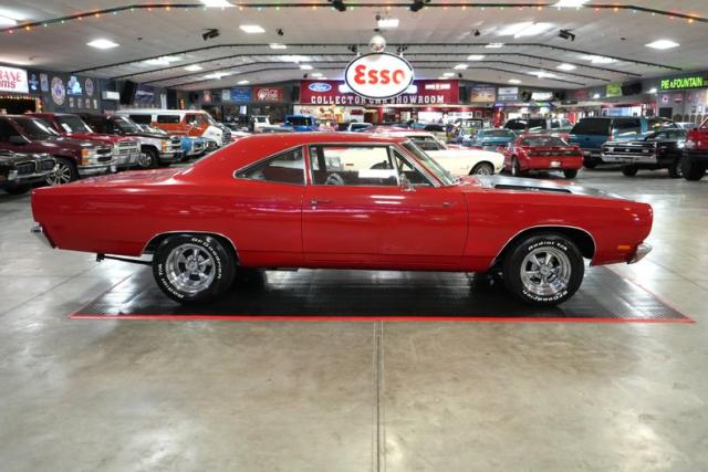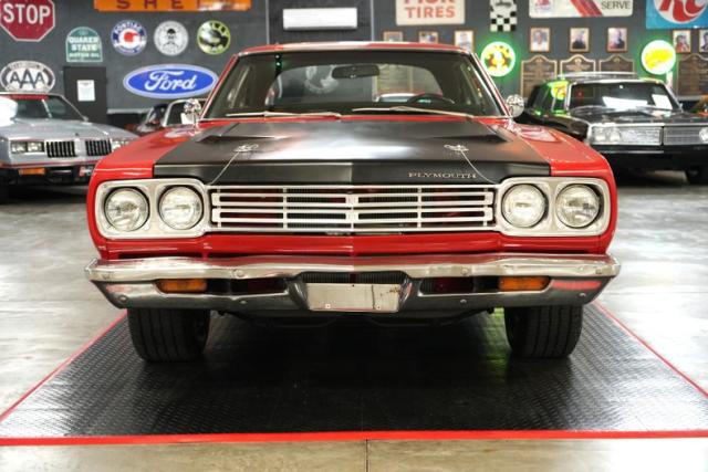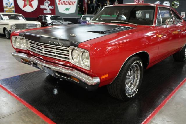 This 1969 Plymouth Roadrunner captures the raw power and aggressive styling of the muscle car era. Powered by a Chrysler 383 Magnum V8 paired with a 727 Torqueflite automatic transmission and a Chrysler 8 rear end with 3.21 gearing, it delivers strong street performance. Power steering and brakes with front discs ensure smooth handling. The red exterior is matched with a black vinyl interior and classic 15\" chrome Cragar S/S wheels wrapped in BFGoodrich Radial T/A tires. Upgrades include an aluminum intake, Edelbrock AVS 600 CFM carburetor, headers, Flowmaster dual exhaust, and aluminum radiator offering both performance and attitude.