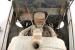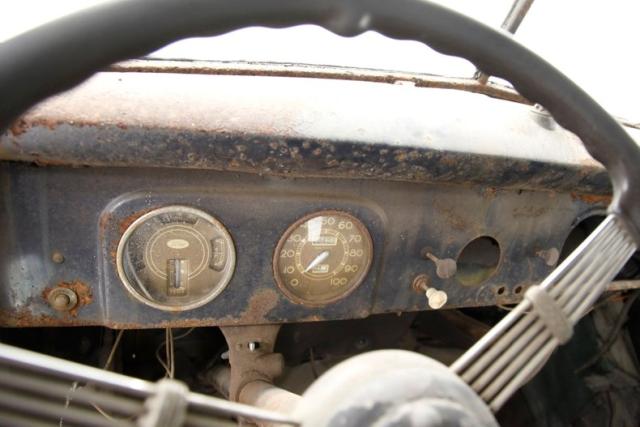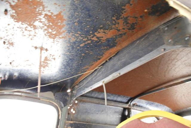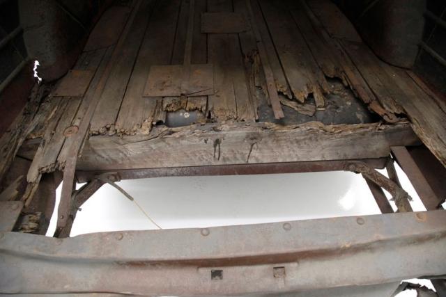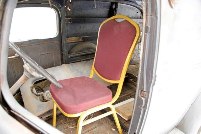 An oiled and dirty wood floor makes up the decking on the back. Metal frames the interior, and there are wood shelves added to the paneled sides. The ceiling of the cargo area has been filled in with sheet metal that is now surface rusted and the front passengers can look up to view the bare steel roof sans material. Some rust is noted between the body panels and the floor. The doors are pure metal with a stamped design to help strengthen them. The paint is rusting on the door panels and the dash is rusted. The floor can be looked through in areas due to missing panels for the floor. A single kitchen chair is resting in front of the 3 spoke banjo steering wheel, which remains in usablecondition.