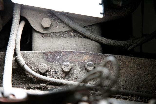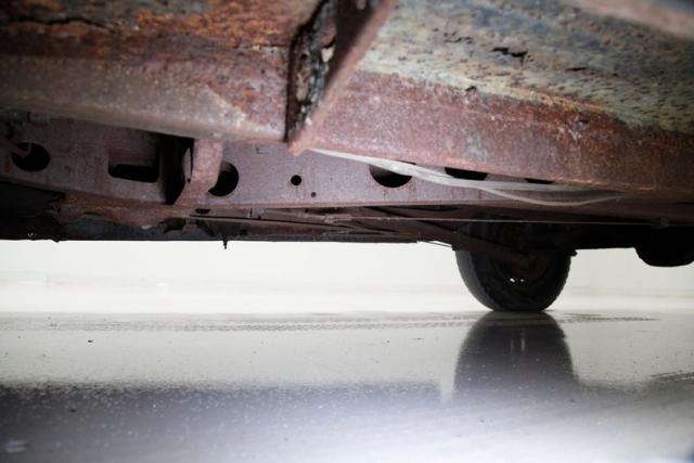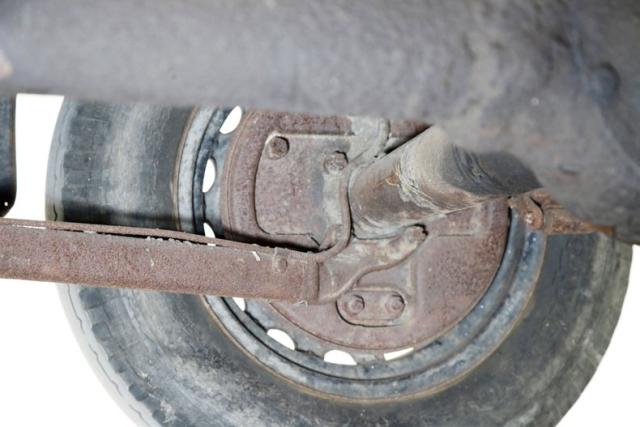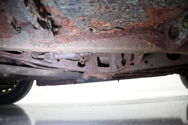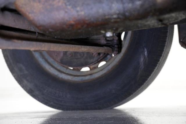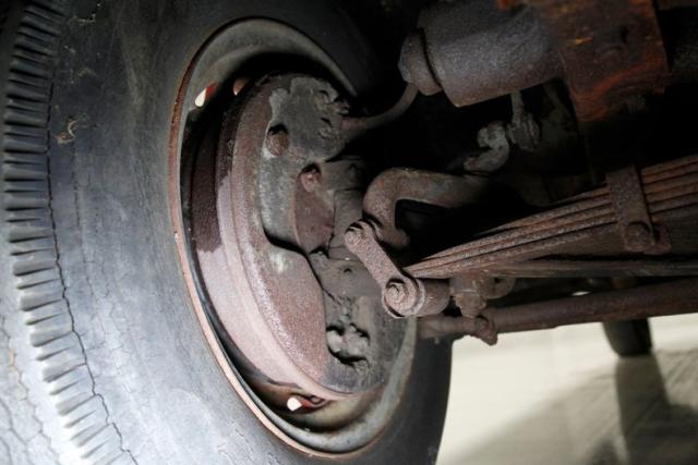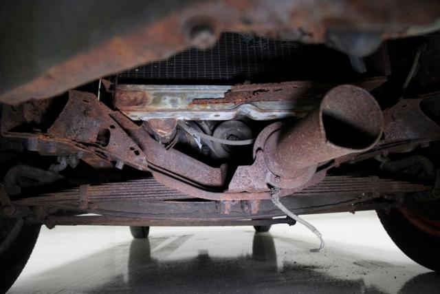 Heavy surface rust is seen on the frame, floorboards and suspension components. Invasive rust is seen in one spot upfront near the radiator support. Some body hangers are heavily rusted and may be structurally unsound particularly at the floorboard areas. Transverse leaf spring suspension is all around, and drum brakes are on all 4 corners.