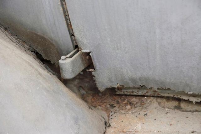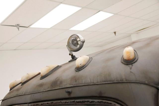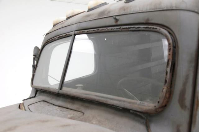 All steel with copious amounts of invasive rust and bullet holes throughout shows on this well worn hauler, so you\'ll need to pick your panels carefully. The van does have the oval grille which can be saved, as well as the side panels for the back of the truck. Fenders are still intact, and the hood, while tweaked, may be salvageable. The windows that are left are original and no delamination is seen. An outboard spare without the cover is on the passenger side, and on the back are dual swinging access doors that have been removed but are resting inside.