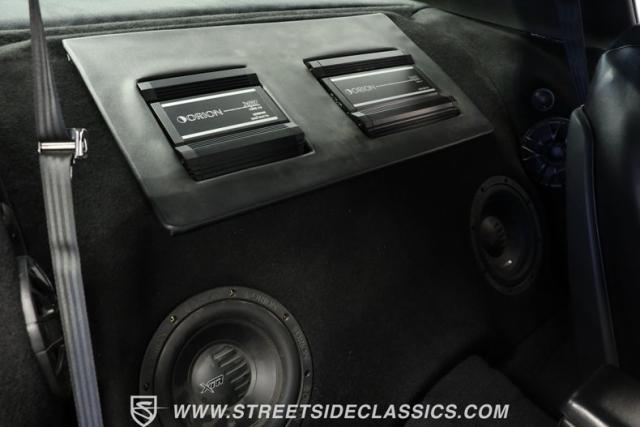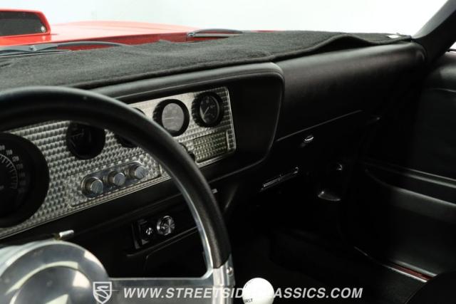 The suspension setup uses RideTech adjustable components and has subframe connectors. Up front are tubular A-arms and air shocks, while the rear features a triangulated 4-link with airbags and shocks. This Trans Am rides on 19-inch front rims with 235/30ZR19 tires, and massive 20-inch rear rims with 345/30ZR20 tires. Behind them are Wilwood power disc brakes with drilled and slotted rotors for ultimate stopping power. And for the perfect muscle car soundtrack, Hedman shorty manifolds feed a dual-exhaust system with Borla mufflers.