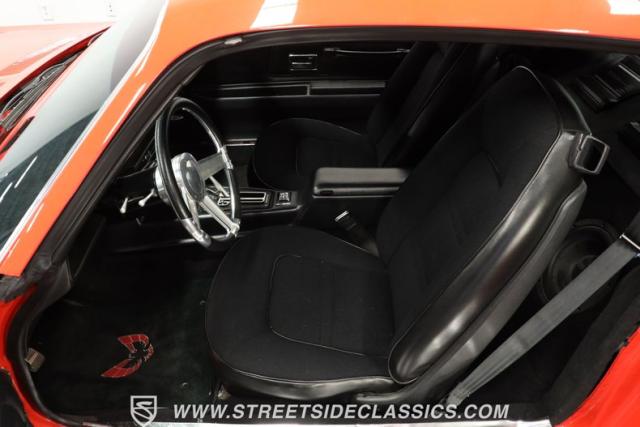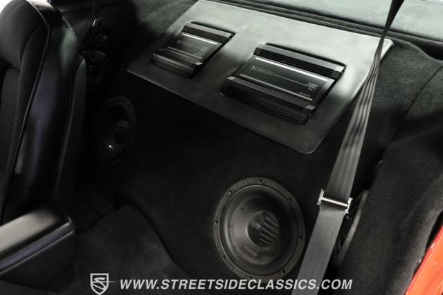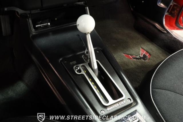 The interior is no different-mostly black, with shiny accents that break up the solid color nicely. The front bucket seats are a mix of vinyl and cloth and remain in good condition, with the door panels following suit. In front of the driver\'s seat is where most of the shine appears: an aftermarket polished-steel steering wheel with a black rim, a shiny stock-appearing gauge cluster, and stock-style gauges set the dashboard off just right. A Pioneer AM/FM/CD/AUX stereo with remote is paired up with an Orion sound system with subwoofers and amplifiers. In the center console sits a Hurst ratchet shifter along with the power window controls. Firebird floor mats keep the well-fitted carpet nice and clean. All door jambs, sills, and weather stripping are tidy and in good shape.