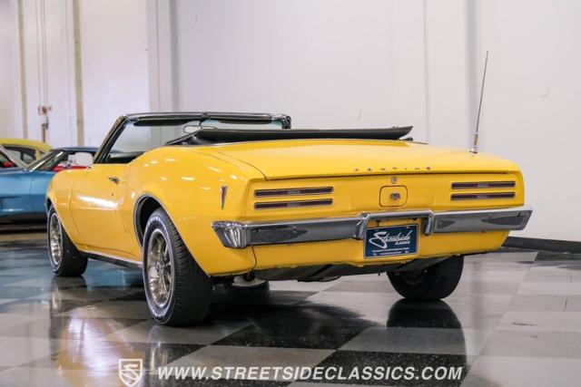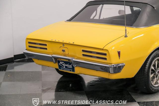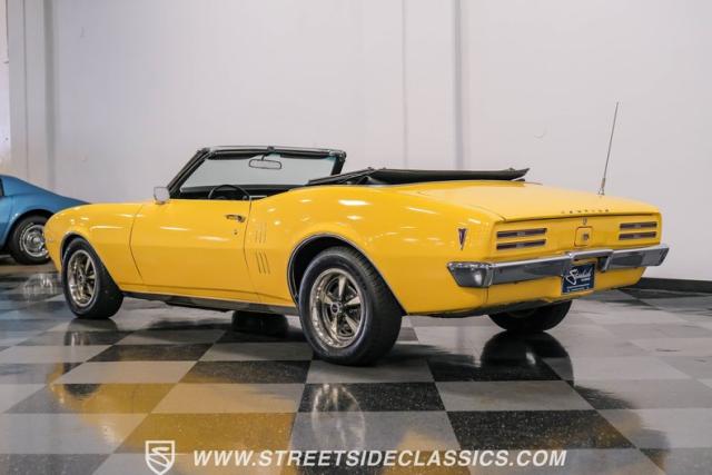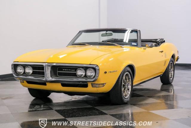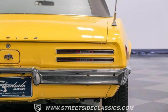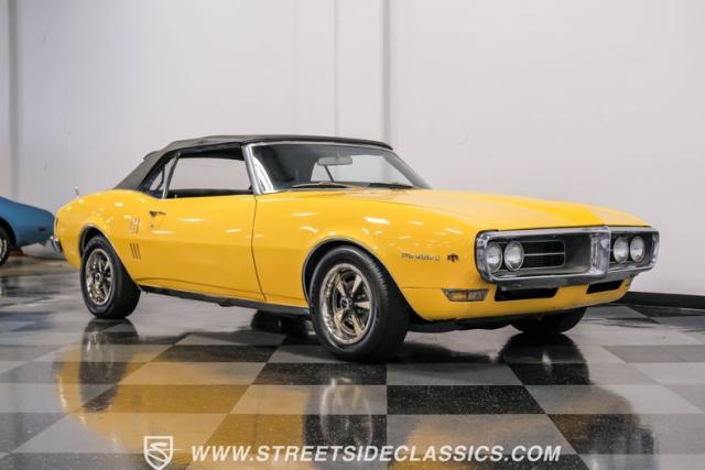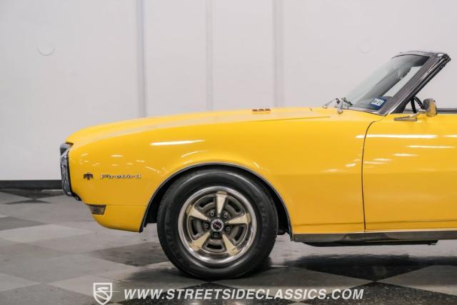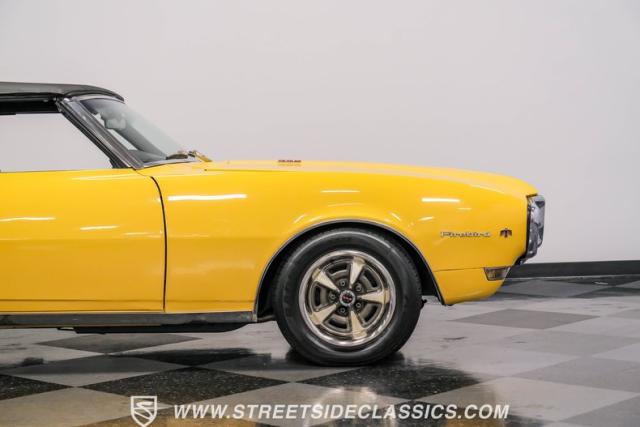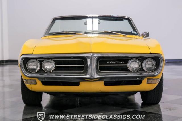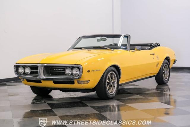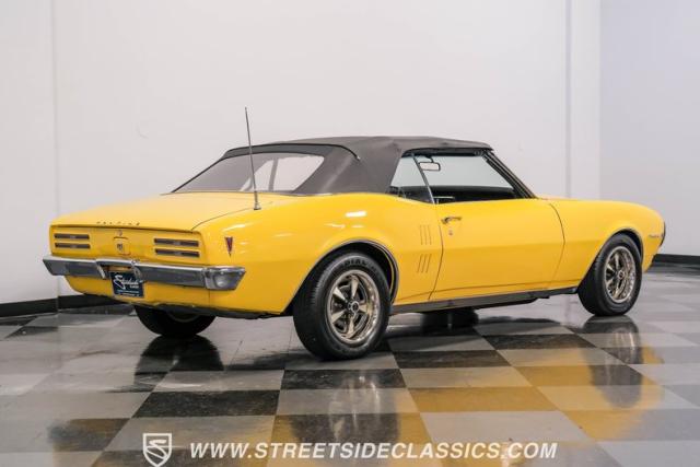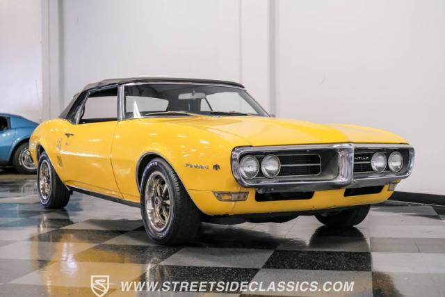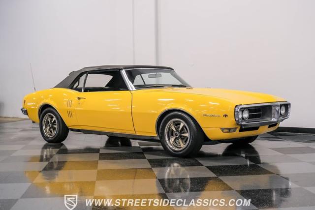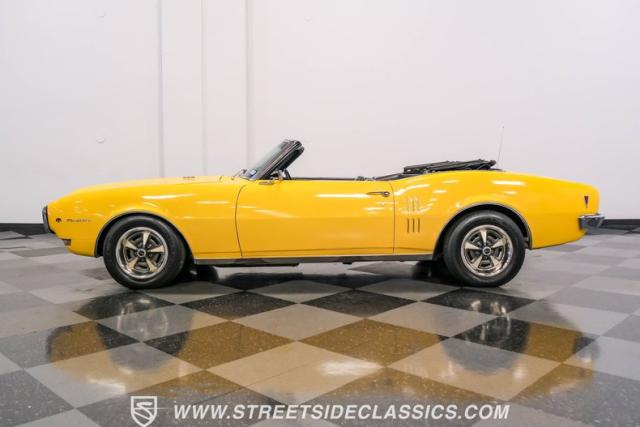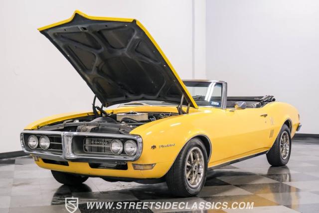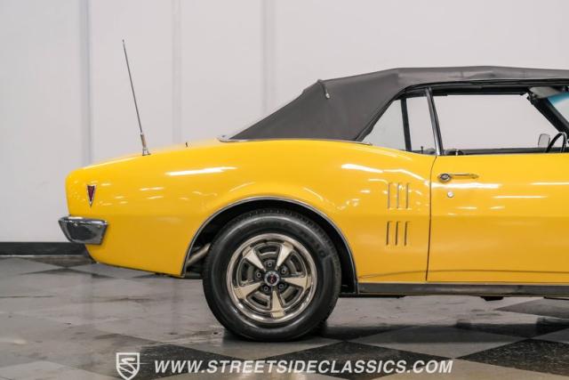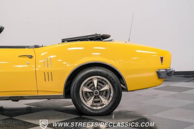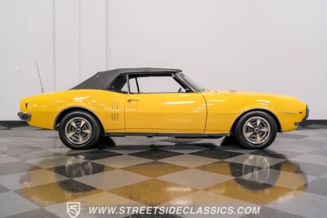 This 1968 Pontiac Firebird Convertible showcases a bold yellow finish that ignites the senses. The vibrant hue accentuates the Firebird\'s sculpted lines, paying homage to its muscle car heritage. A black vinyl top adds contrast and versatility, allowing open-air cruising at a moment\'s notice. The iconic Rally II wheels complement the car\'s aggressive stance, wrapped in 205/65R15 tires, they provide ample grip for spirited driving. Chrome bumpers and trim pieces shine brilliantly against the yellow paintwork, while the distinctive Firebird emblems proudly announce this Pontiac\'s lineage.