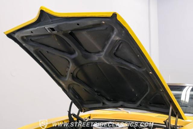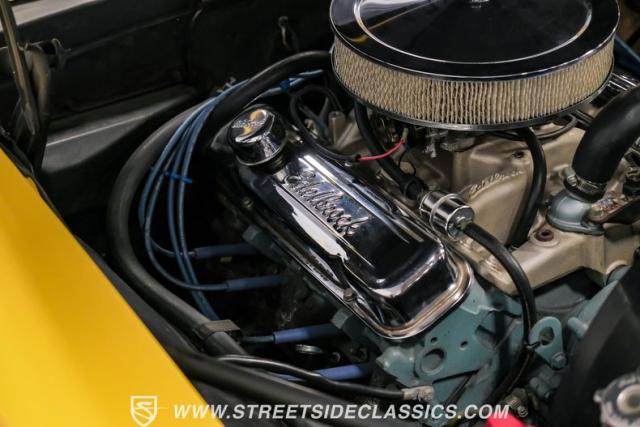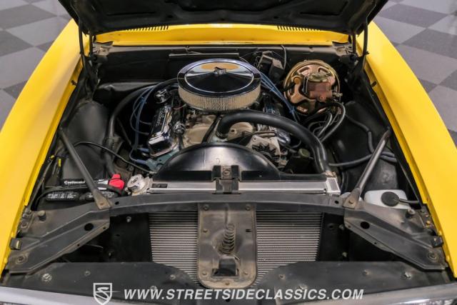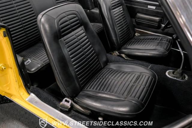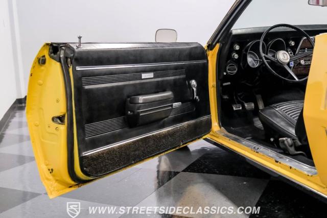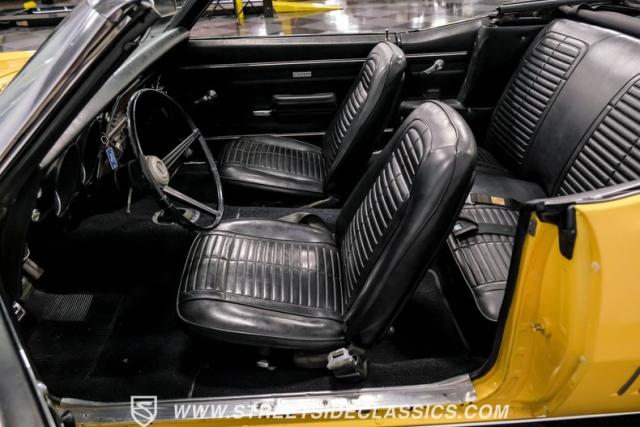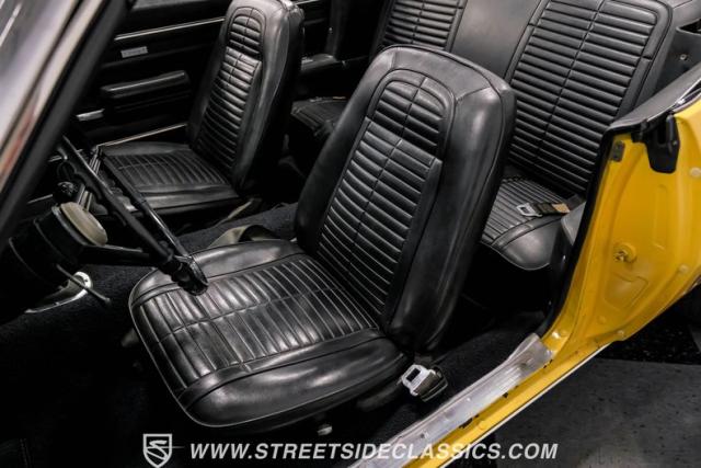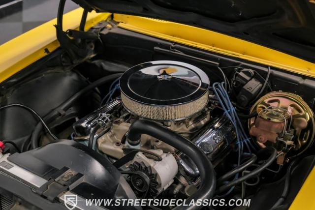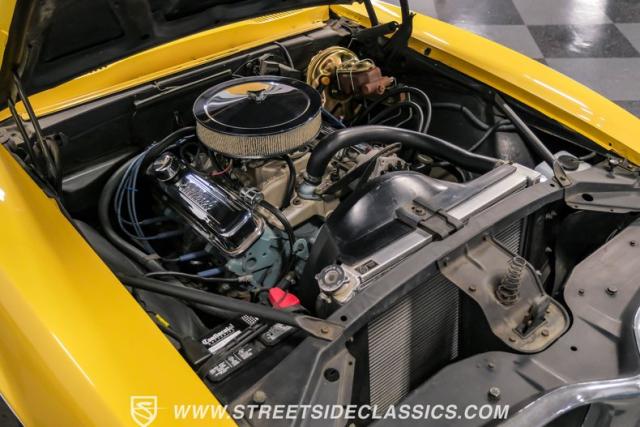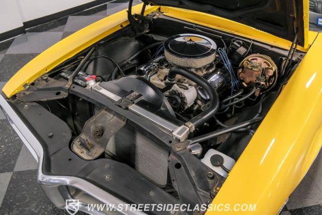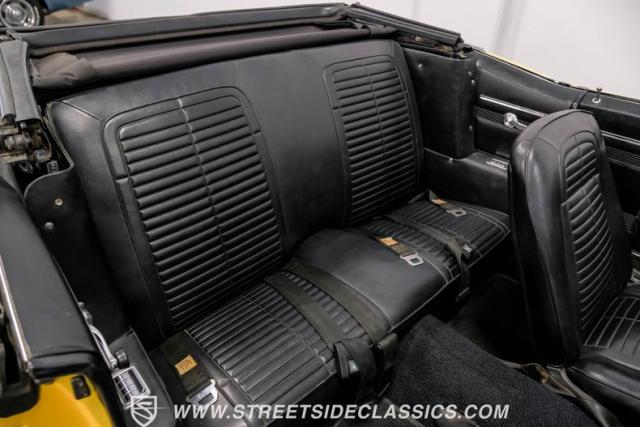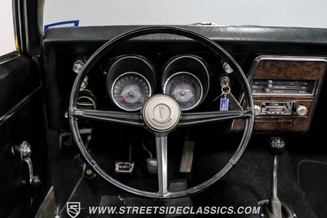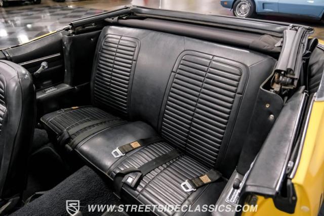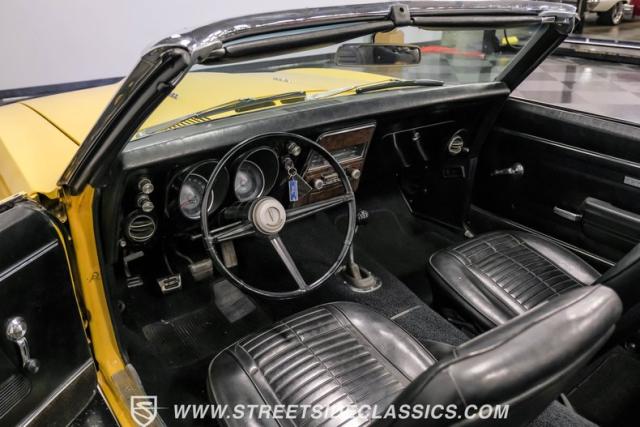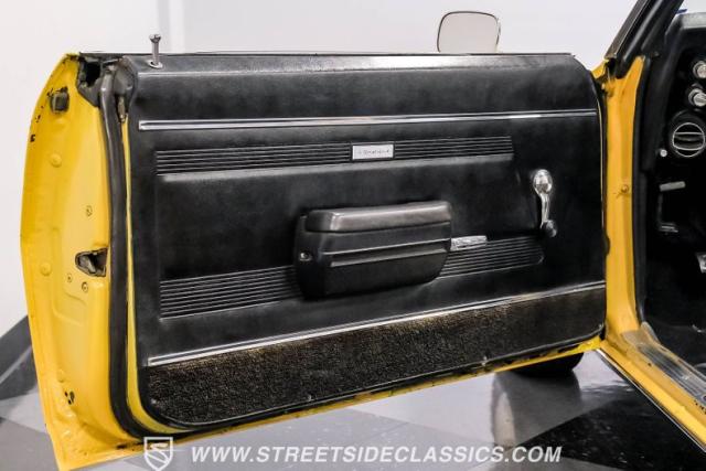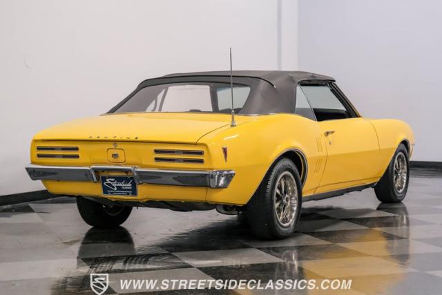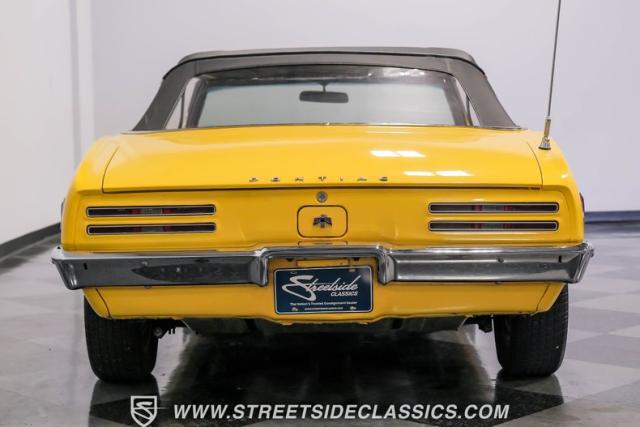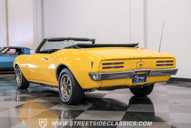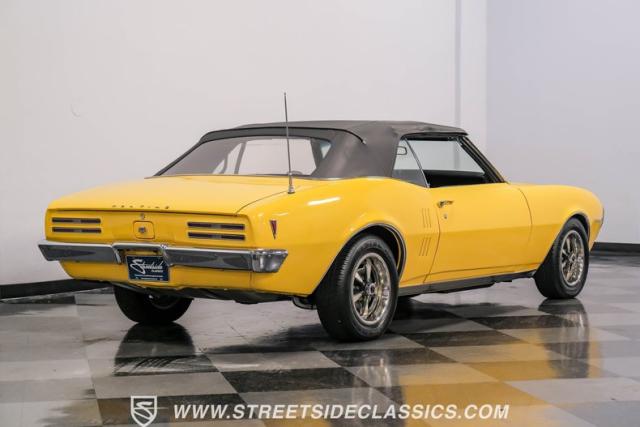 This 1968 Pontiac Firebird Convertible showcases a bold yellow finish that ignites the senses. The vibrant hue accentuates the Firebird\'s sculpted lines, paying homage to its muscle car heritage. A black vinyl top adds contrast and versatility, allowing open-air cruising at a moment\'s notice. The iconic Rally II wheels complement the car\'s aggressive stance, wrapped in 205/65R15 tires, they provide ample grip for spirited driving. Chrome bumpers and trim pieces shine brilliantly against the yellow paintwork, while the distinctive Firebird emblems proudly announce this Pontiac\'s lineage.