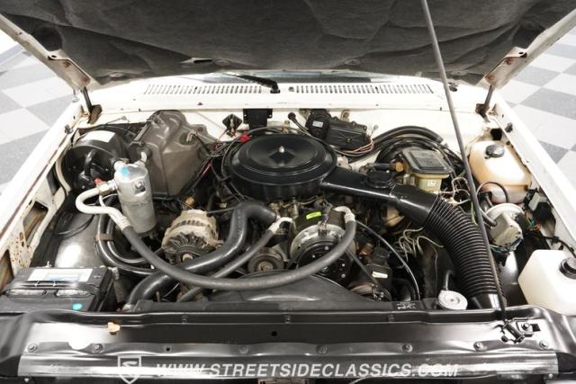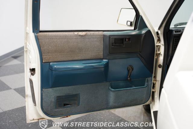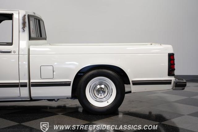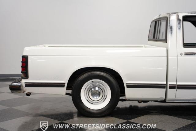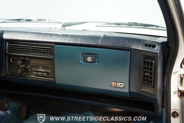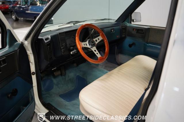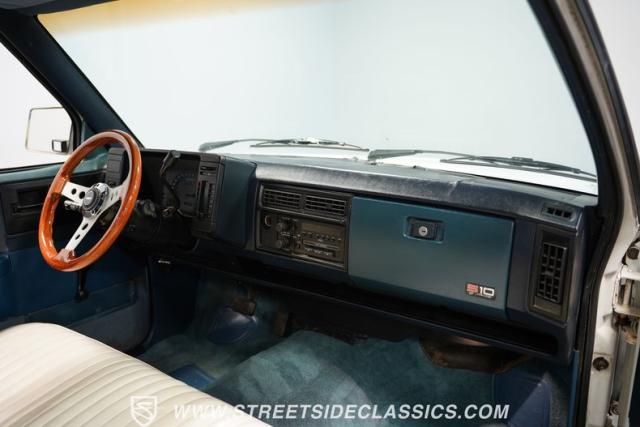 This 1987 Chevrolet S10 Tahoe showcases GM\'s compact truck innovation with a custom twist. Its lowered profile and classic steel wheels with dog dish hubcaps channel the spirit of 1960s C10 trucks. The white exterior wears its years proudly, while the badge-delete grille adds a sleek, custom touch. Fitted with 15-inch wheels, 205/65R15 tires up front, and meatier 245/60R15 rubber in the rear, this S10 brings attitude to the streets.
