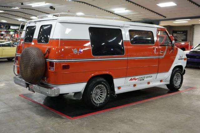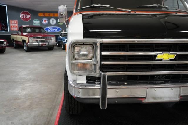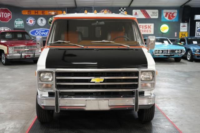 The 1978 Chevrolet G20 Good Times AJ Foyt Coyote Edition Conversion Van is a rare and stylish tribute to the racing legend. Powered by a 350 Small Block Chevy V8 paired with a GM TH350 automatic transmission and GM 10-bolt rear end, this van delivers smooth performance. Features like power steering, power brakes, air conditioning, cruise control, and a CB radio with an 8-track stereo add comfort and convenience. The orange and brown interior includes four swiveling captain\'s chairs with a table and a third-row bench. Exterior highlights include Keystone Turbo III wheels, a roof rack with a ladder, and aluminum running boards.