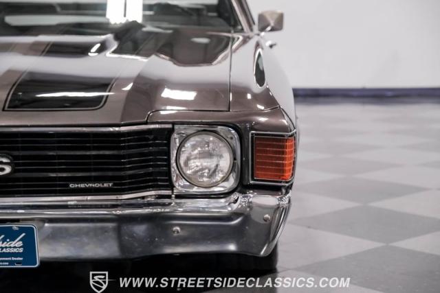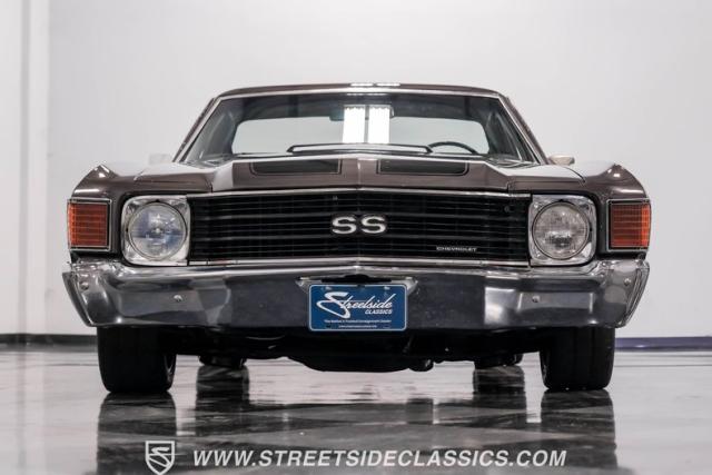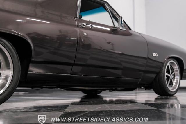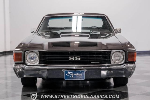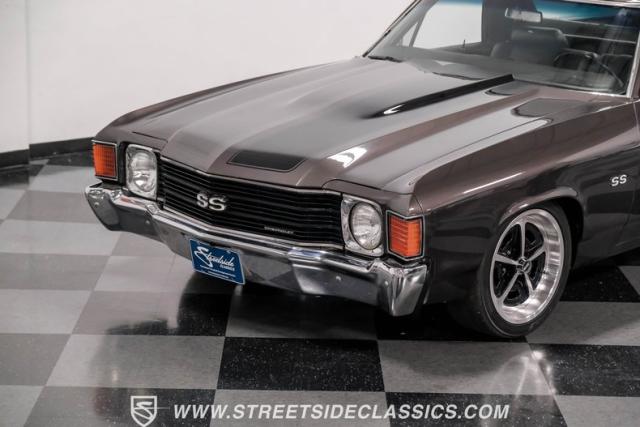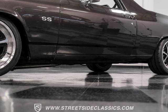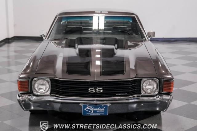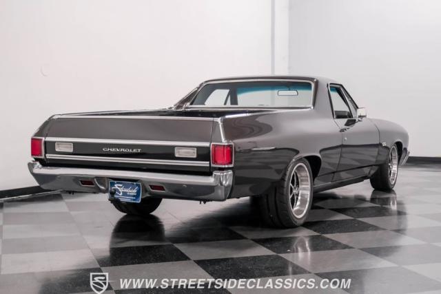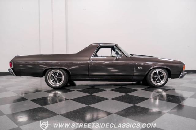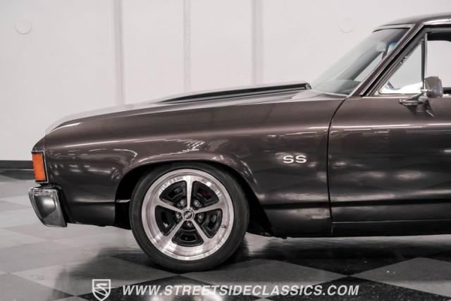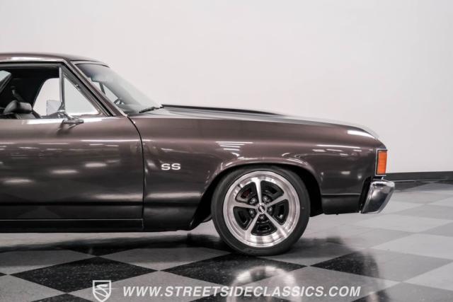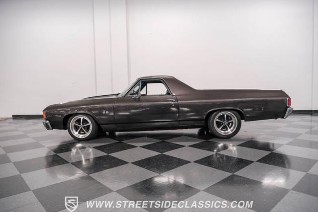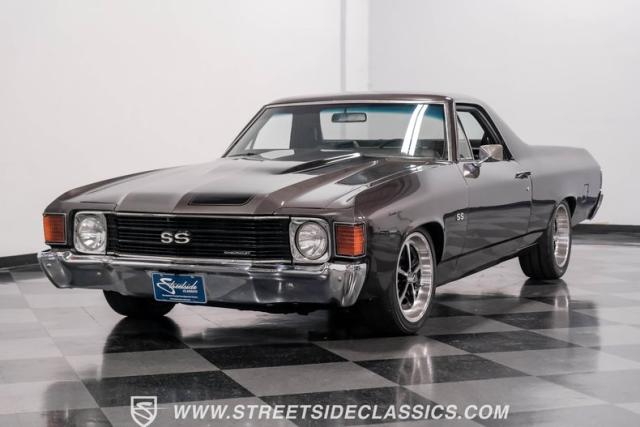 Born from the golden age of muscle, this 1972 Chevrolet El Camino SS Tribute is a bold fusion of utility and performance. Drenched in a Pepper Gray Metallic hue with assertive black SS stripes, it is a true standout on the streets. The iconic El Camino silhouette is enhanced by a cowl hood, blacked-out grill and SS badging on the front fenders and rear tailgate add to its race-ready personality. A lowered front end with tubular lower control arms and a set of 17-inch alloy wheels cleverly styled to resemble the original factory steel SS wheels with tires staggered 235/40ZR17 front and 275/40ZR17 rear give this classic a confidant stance.