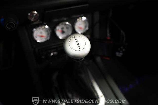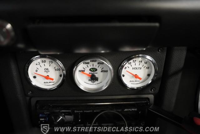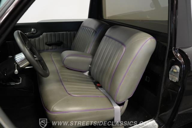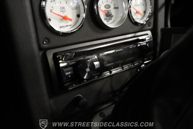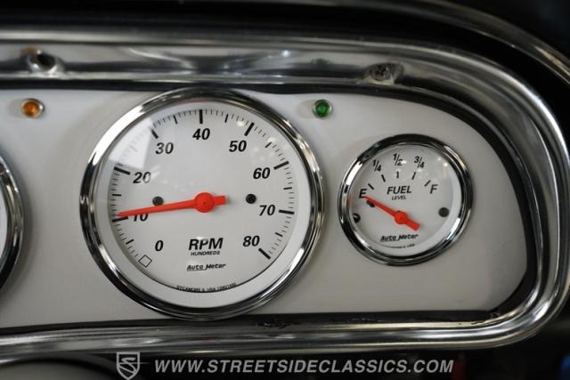 The interior has been thoroughly reimagined while still retaining an authentic vintage appearance. Front and center is a plush and comfortable gray vinyl bench seat with contrasting piping, nicely complemented by the darker carpeting that lines the floor below. An aftermarket steering wheel is perched on a tilting column that positions it right where you need it, and the instrument panel just beyond it features an assembly of white-faced AutoMeter gauges encircled by a chrome bezel. The added climate control system ensures that you can enjoy this classic throughout the year, while an AM/FM stereo with an auxiliary port and Bluetooth connectivity provides all the audio options you need during your journeys.