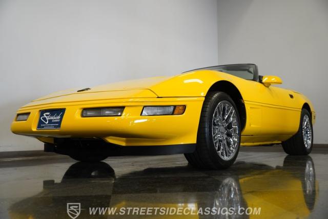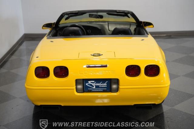 If you\'re a fan of sports cars, this Competition Yellow 1996 Chevrolet Corvette Convertible should make you feel a little warm and fuzzy on the inside. Showing 58,332 believed-to-be actual miles, this Corvette is a standout in both condition and presentation. The body is straight and clean, even free of the typical nicks and chips on the front fascia that many Corvettes suffer from. The paint shows no blemishes or flaws, the headlight and taillight lenses are clean, and the weather stripping and glass are in good condition. The black canvas convertible top is also in good condition, and the chrome C6 ZR1 wheels give this Corvette a sharp, updated look.
