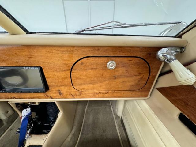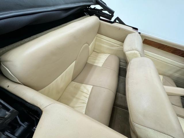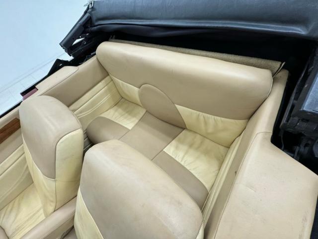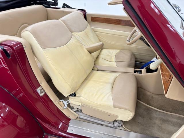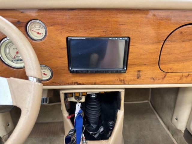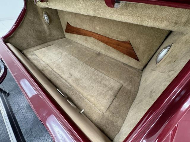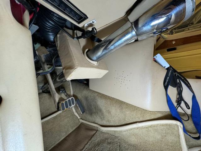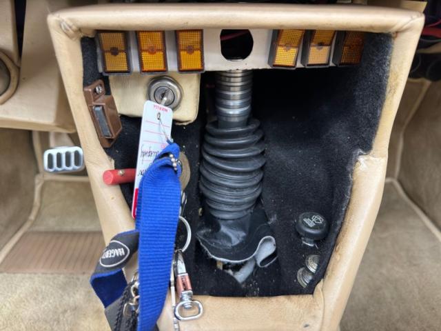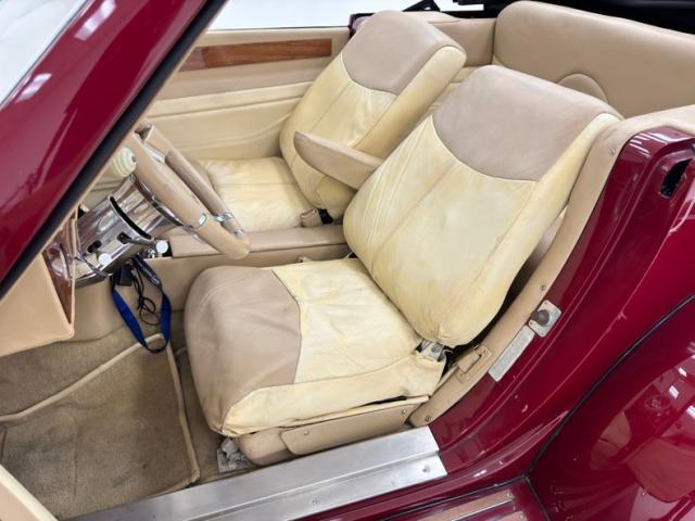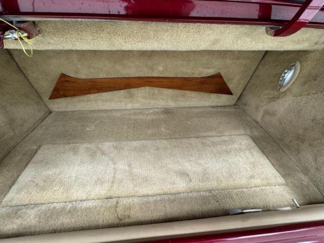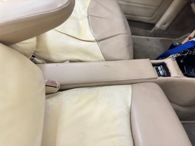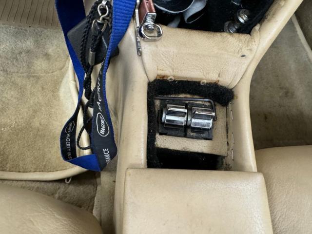 Tan and beige leather doors cards begin the affair and are augmented by a wood panel, maple perhaps, and lacks any window cranks or buttons and door pulls. Inside, loosely fitted tan and beige seat covers dress the front bucket seats and the back bench enjoys pleated leather in geometric patterns that bring in a touch of the 80\'s. The steering wheel shows some patina but also represents the period with nickel and polished metal spokes in front of a flat wood dashboard that houses a myriad of ivory faced Classic Instruments gauges offering the typical bits of information. In the center, a screened entertainment system with AM/FM/CD and below, a row of lighted toggle switches in a carpeted storage bin. Metal toggles are a bit low and seem to be missing a panel in the center console, which is replete with patina. Plush beige carpet covers the floor with fitted mats on top.