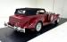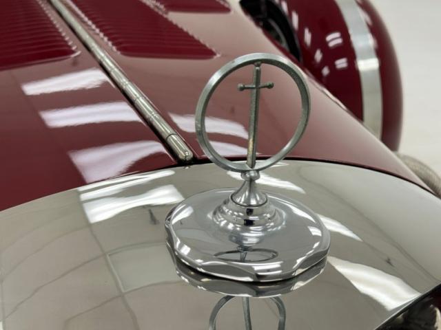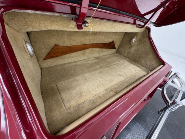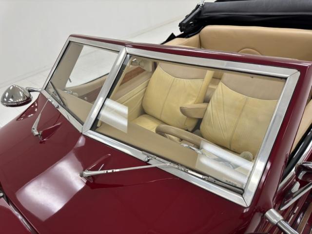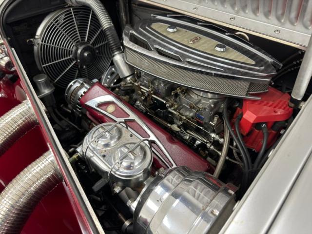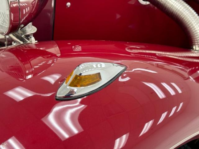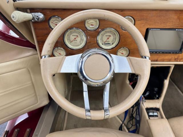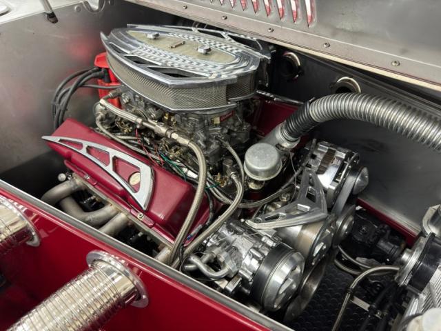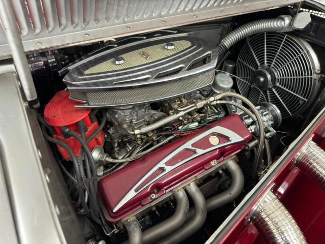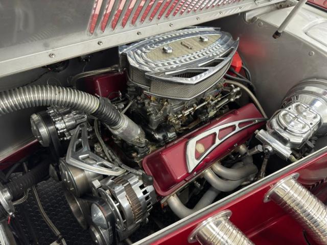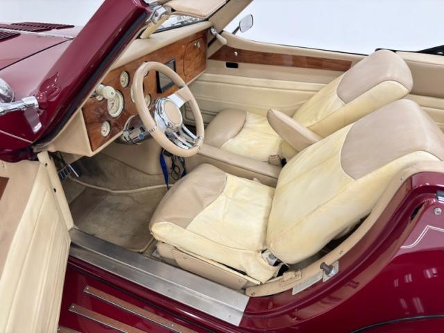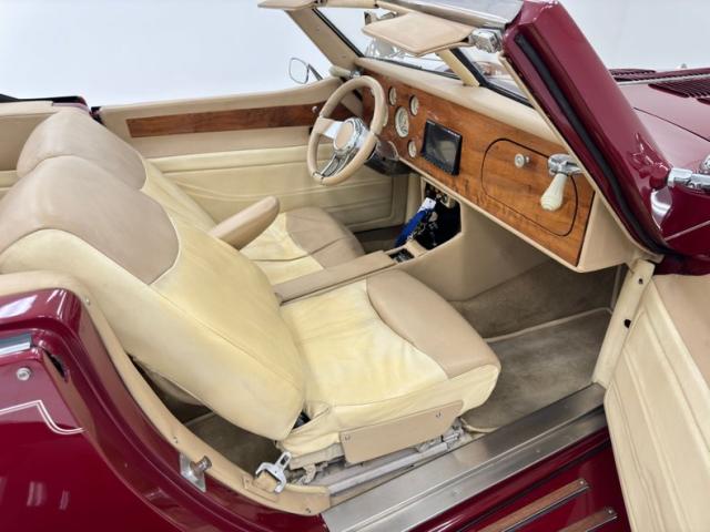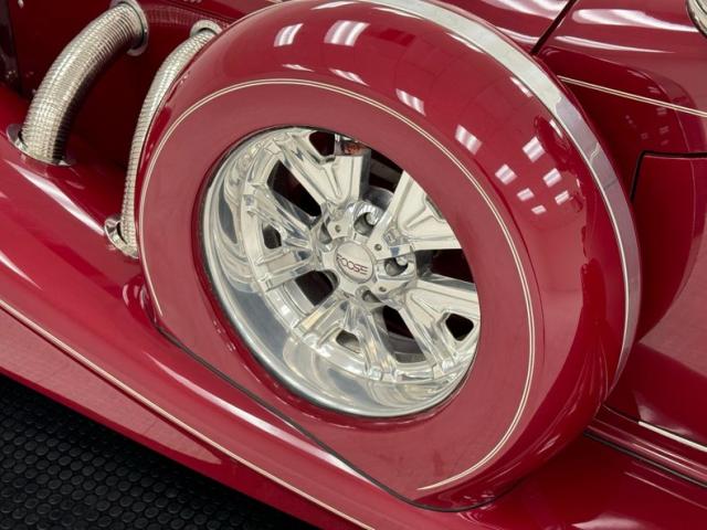 We\'ll start with the color, which is dark red, but it\'s the shape that demands attention more than anything else. Long sweeping front fenders flow back to become running boards. That\'s where the back end of the car starts with arching rear fenders that lead to a square trunk behind a straight quarter panel. It\'s an abrupt end to a car that takes a mile to get there and starts with large, external headlight buckets behind horns that may have come from the days of gladiator exhibitions in the Roman Colosseum. There\'s nothing subtle about them as they flank a center light, because nothing is typical on this car, and that\'s the appeal! Even the bumpers are a complex arrangement of robust metal barrels and ribbons and unlike anything mass produced. 17-inch Foose Fishtail C wheels adorn each corner and the encased spares on each front fender. The black canvas top houses a slightly milky plastic window in back and that\'s the only imperfection we could find on this rolling piece of art.