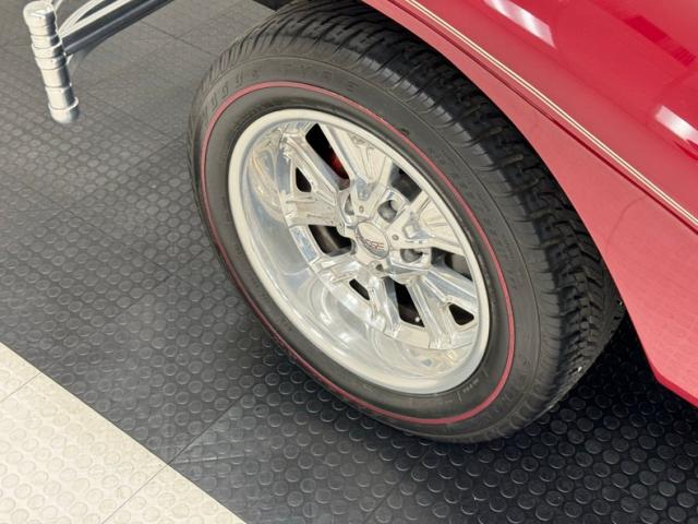Opening the hood reveals a showy engine with unique billet style pieces that include the air cleaner box and other polished components. It\'s a 383ci stroker V8 which our consignor claims is good for 505 horsepower. It\'s topped by dual Edelbrock 4-barrel carburetors and set into motion with a 700R4 4-speed transmission that sends power to the rear axle with 2.59 gears. Behind each Foose wheel is a power disc brake.