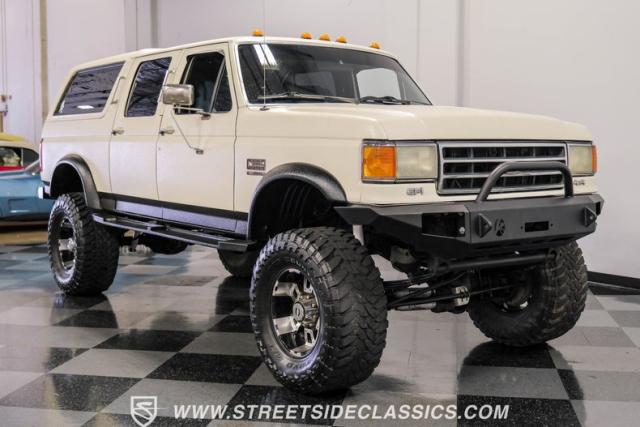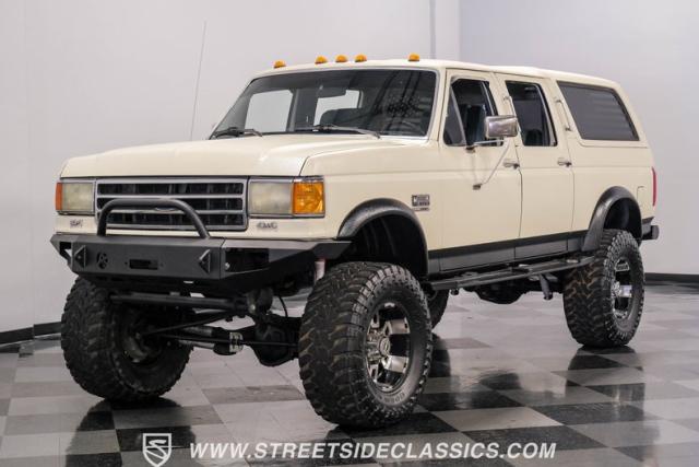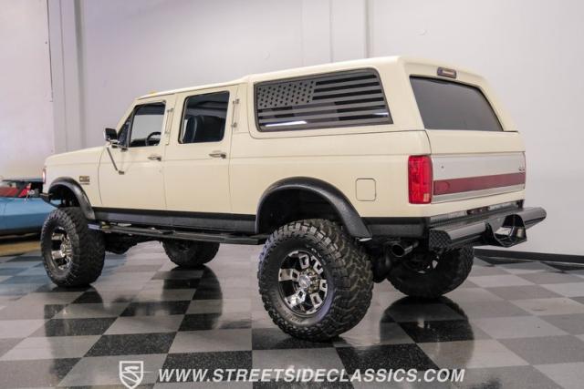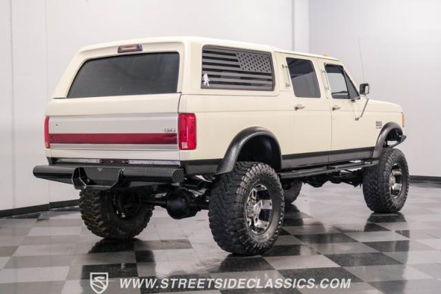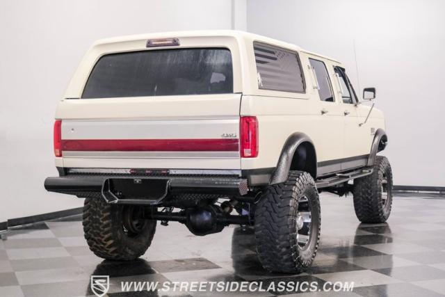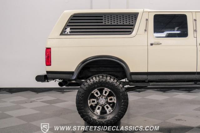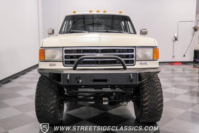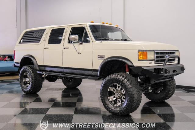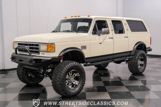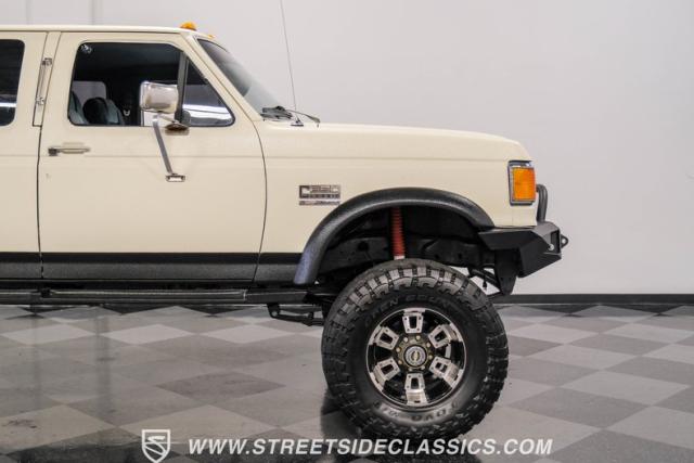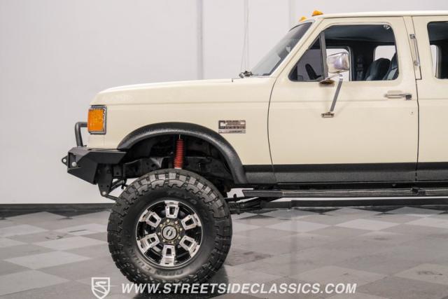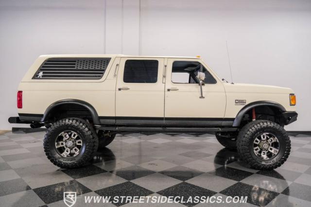 This 1991 Ford C-350 XLT Centurion Bronco, built before the Excursion era, is a true rarity on the road. Recently coated in off-white Rhino-style paint, this monster of a vehicle dominates both street and trail. Its exterior boasts giant steel bumpers, rugged side steps, and a patriotic American flag decal on the hardtop windows. The 18\" Diamo rims, wrapped in massive 38X15.50R18LT tires, give this Bronco an unmatched presence.