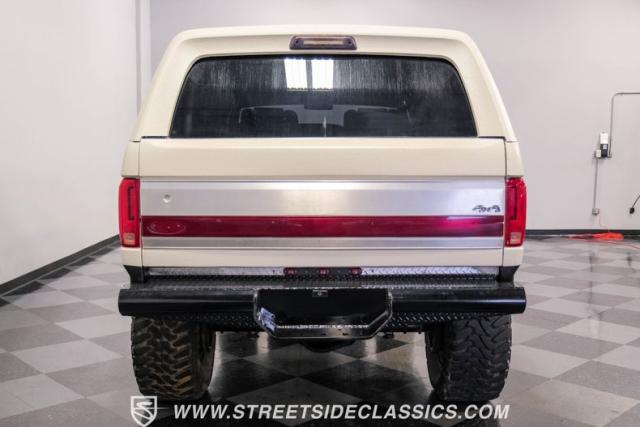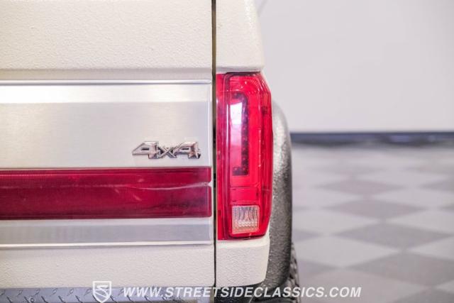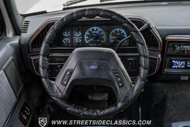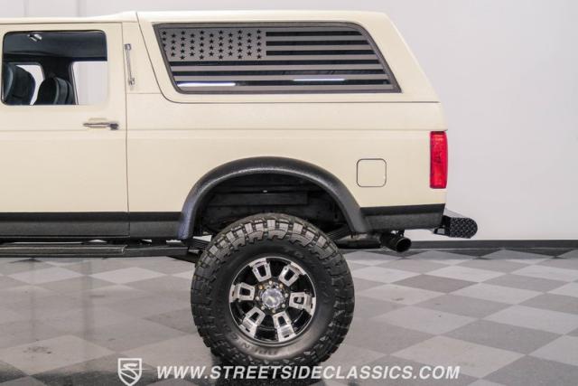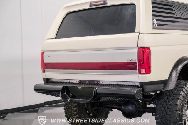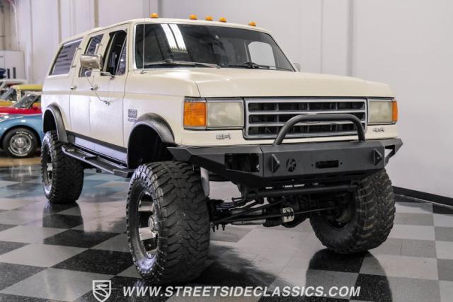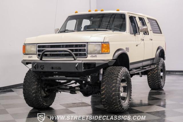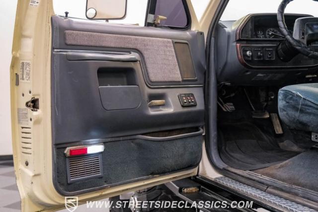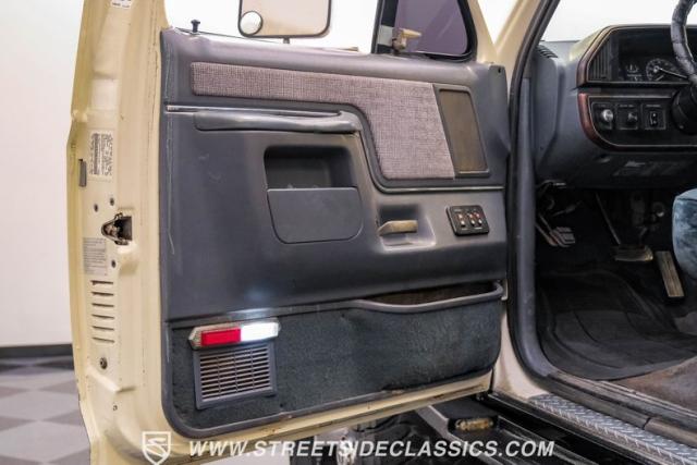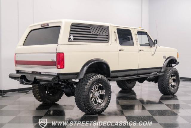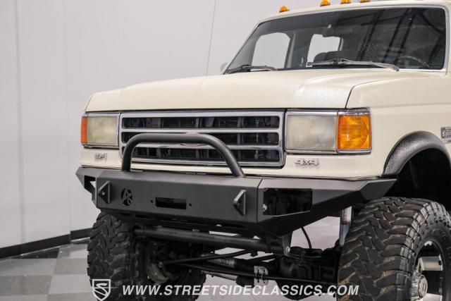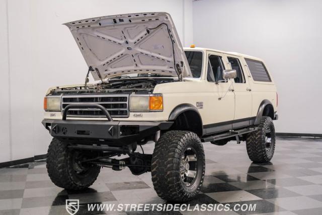 This 1991 Ford C-350 XLT Centurion Bronco, built before the Excursion era, is a true rarity on the road. Recently coated in off-white Rhino-style paint, this monster of a vehicle dominates both street and trail. Its exterior boasts giant steel bumpers, rugged side steps, and a patriotic American flag decal on the hardtop windows. The 18\" Diamo rims, wrapped in massive 38X15.50R18LT tires, give this Bronco an unmatched presence.