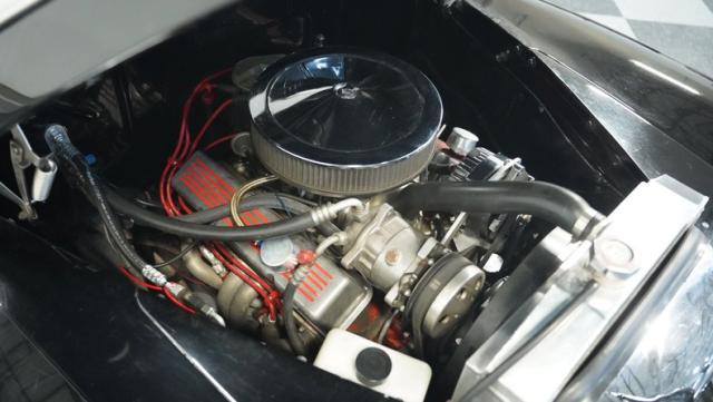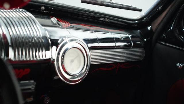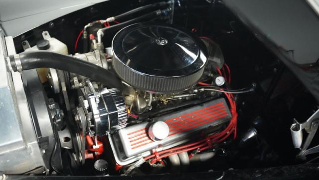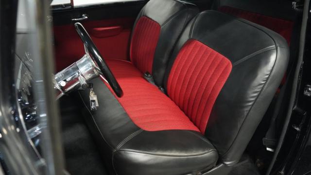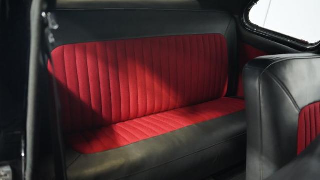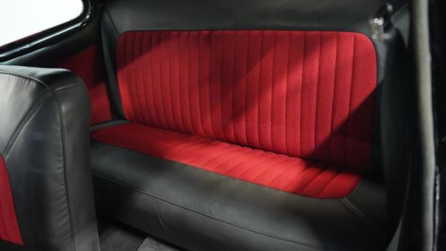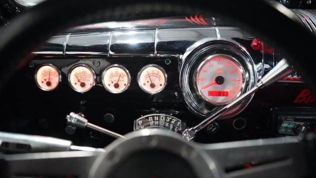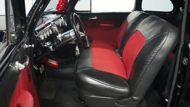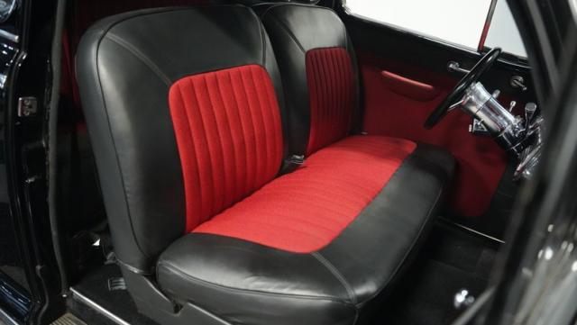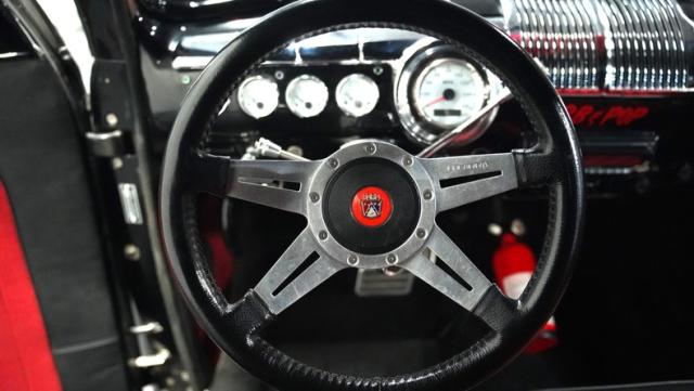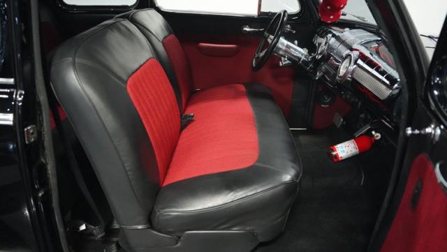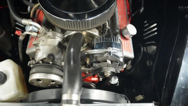 A red and black interior cranks up the intensity with its custom two-tone vinyl and cloth combination. The split-bench seat offers the perfect perch for long hauls or quick blasts down your favorite back road. The chrome tilt column puts total control at your fingertips, while auxiliary gauges monitor all the vitals. An Alpine audio system pumps out the decibels, and ice-cold air conditioning keeps you cool when you\'re running hard. Power steering makes this rod as easy to handle as your daily driver, with the column-mounted shifter falling naturally to hand.