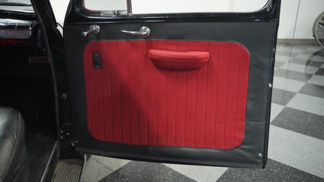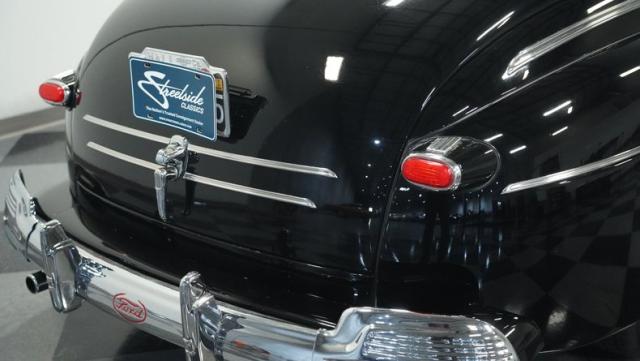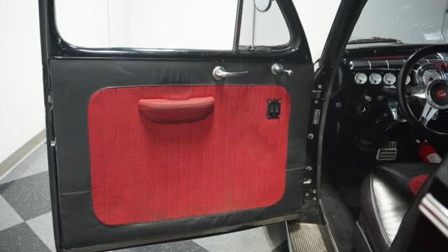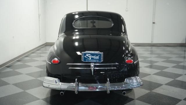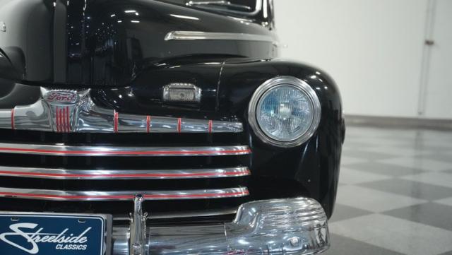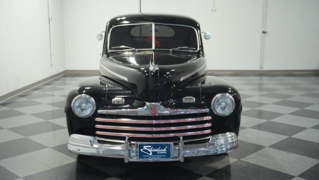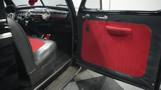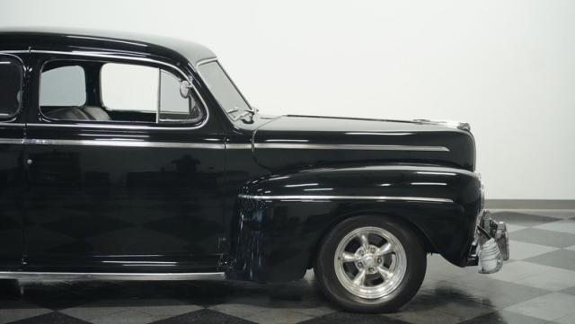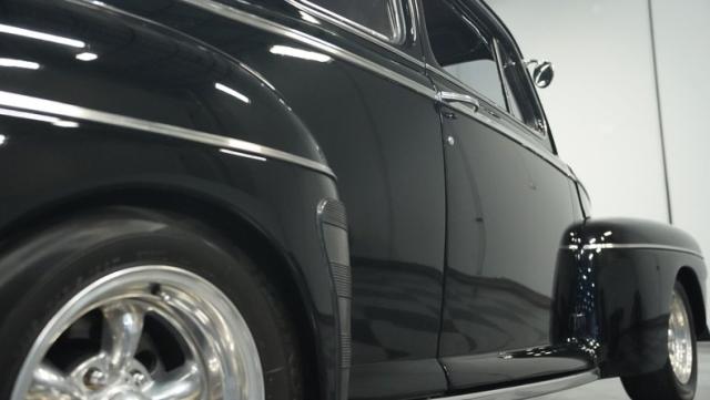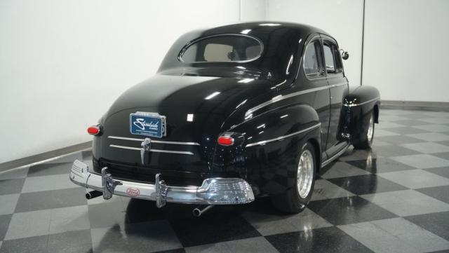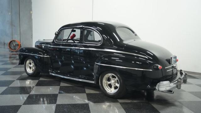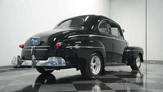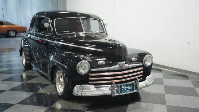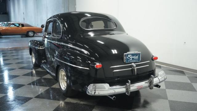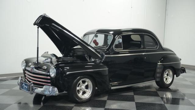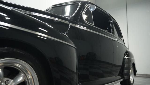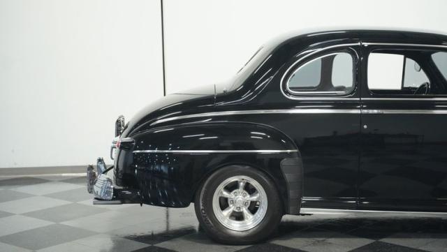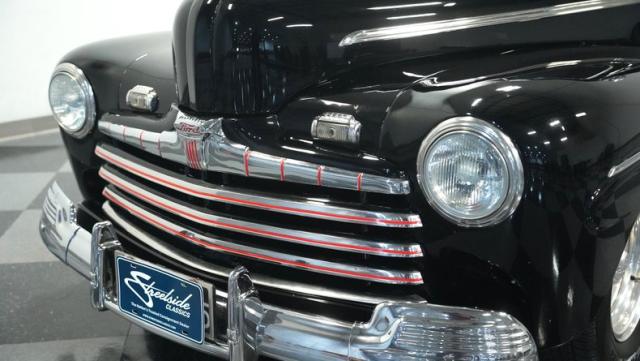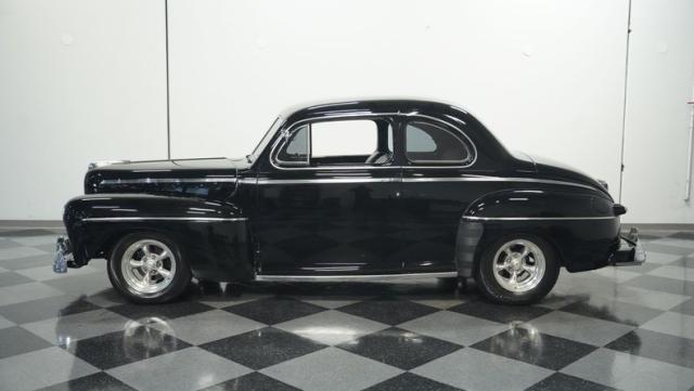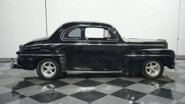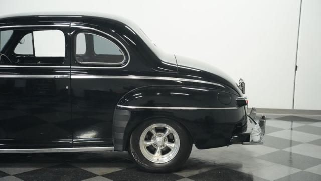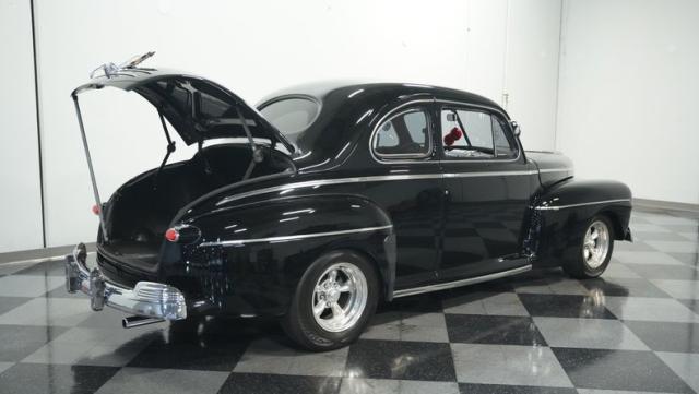 This 1946 Ford Coupe brings street rod attitude with its mile-deep black finish and killer stance. The streamlined body has been meticulously massaged, creating fluid lines from front to back. American Racing Torq Thrust 15-inch wheels put the power to the pavement through meaty 225/70R15 front and 215/65R15 rear rubber. LED tail lights add modern-tech visibility while custom tinted glass provides a sinister edge. The chrome accents gleam against the midnight paintwork, creating a street rod that\'s both old school cool and new school tough.