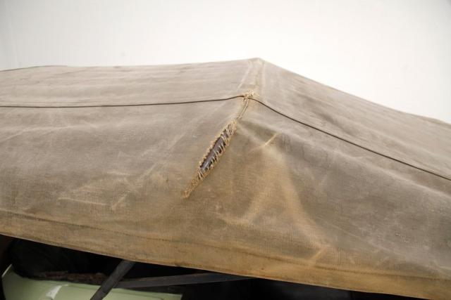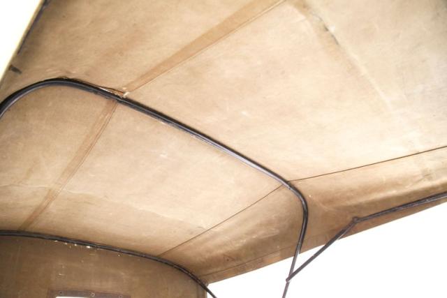 With a rust free steel body painted in key lime pie yellow, there is little to no rust in the exterior panels. A thin body style with cowled hood in front, stainless steel radiator surround with Citroen badge in its center and circular head lighting leading the way. It is a 2 door coupe and sports a slight boat tail design for the back of the car which houses one large single seat directly between the two front buckets. High curved black painted fenders float way above the wheels which are in 400mm artillery black painted style, wrapped in 135R400 rubber all around. Between the front and rear fenders are running boards to allow easy access to the passenger comportment. Above, an original style canvas top shows some staining and soiling, and only slightly coming apart at the seams due to dry rotting of the threads. Overall this top is in fair to good condition given its age. It does move up and down flawlessly. On back a spare tire hangs just aft the the boat tail curved rear bodywork.