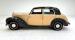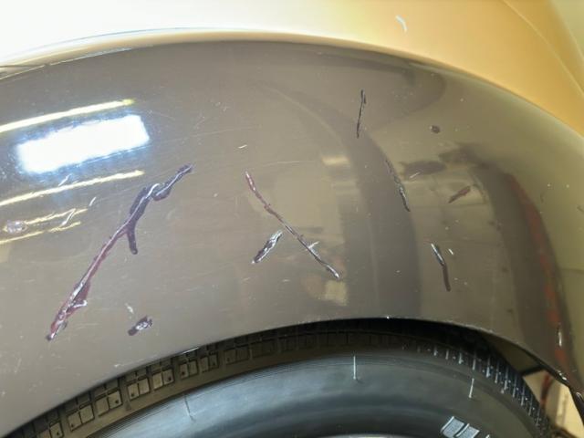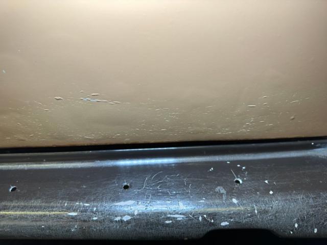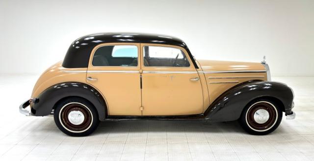 Dark brown fenders and roof sandwich a tan body. A tall and broad grille with mesh is flanked by the extended front fenders housing single headlights rather low and wide on the car while mismatched fog lights ride on the bumper just inside of the conical turn signals. Side strake trim pieces flow along the long engine cover sides where the A-pillar flows into the seam of the reverse opening front doors. The rear doors open traditionally and contour to the rear fender while the height of the cabin is accentuated by the brown roof which waterfalls to a C-pillar around a smaller rear window. Like some American cars at the time, the taillights are tiny in comparison to the sheer real estate of the rear of the car, mostly consisting of a bulbous trunk lid. 15-inch steel wheels are painted a different shade of brown, they may have been tan before, and wear Mercedes embossed dog dish type hubcaps. The car is unrestored and the paint and brightwork show their age. Imperfections are many and include checking paint, large chips that have been touched up, scratches, cracking and crackling, numerous scratches, missing paint, some pitting on the metal, scratches or missing paint on the wheel paint.