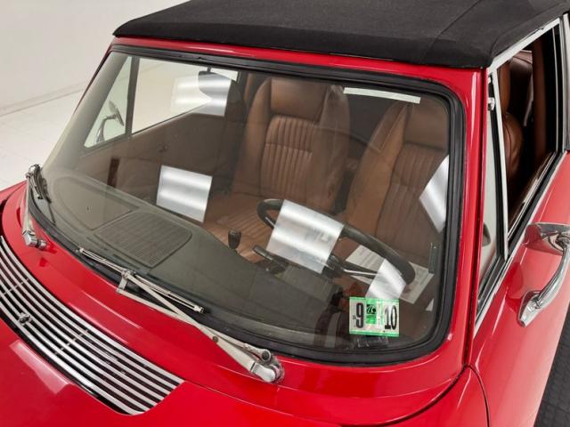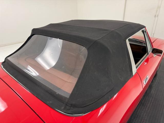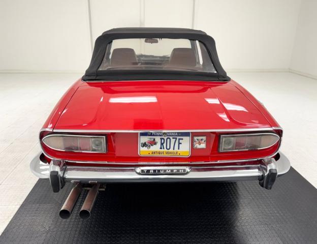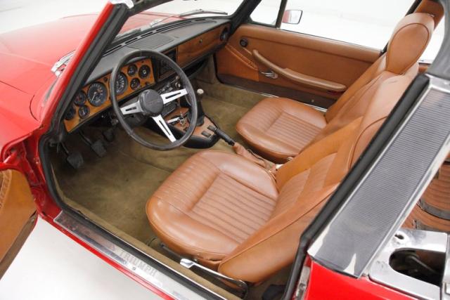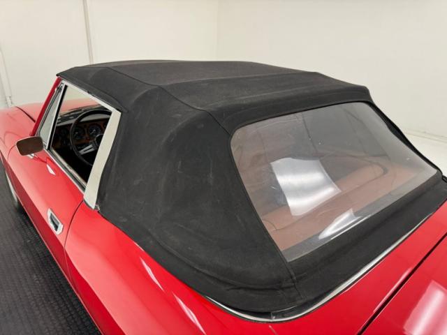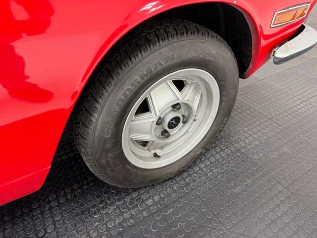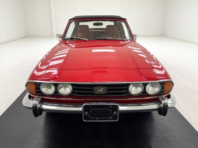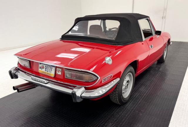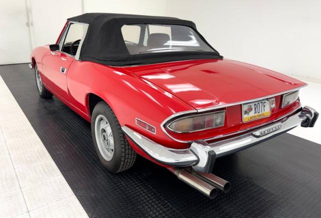 A double edged pointed spear like styled grille trimmed in chrome and supporting dual headlights and a triangular orange signal light in either corner leads the way. A nice shiny bumper with vertical push bars is on below and all this adds up to give the car a unique look. A center badge of a prancing Stag is noted on the grille. Steel is very straight, gaps are nicely managed, and it is bathed in red paint which shows nicely and is a factory matching respray with no rust or inclusions but does show some dings and scratches. The unique feature of this convertible 4 passenger car is the addition of a B pillar just behind the driver\'s door that becomes the rear base for what is a top structure. The front support being the windshield surround in polished chrome. The top structure is black texture coated steel. This was deemed necessary for structural rigidity for the car and support for the rag top. The top is back canvas and moves up and down easily by hand. No T insert panels are necessary or available even as an option. The top folds neatly down into a space behind the rear bench and a wide chrome trimming surrounds this area of the tonneau covering. So if it spits and you need to wear your Wellies, just put the top up and you are \"covered\". On back the mid 70\'s Spitfire-esque styling continues with another double pointed edge spear, edged in chrome complete with matching spear shaped taillights that slightly wrap around to the rear quarters. Another bumper with vertical push bars is nice and sleek and wraps around the quarters as well and a marker light floats just above. Some very light beginnings of chrome pitting are seen on this bumper. 14-inch cast aluminum wheels are on with a center hub badged with a stag. Jesus loves you more than you will know, Whoa, whoa, whoa.